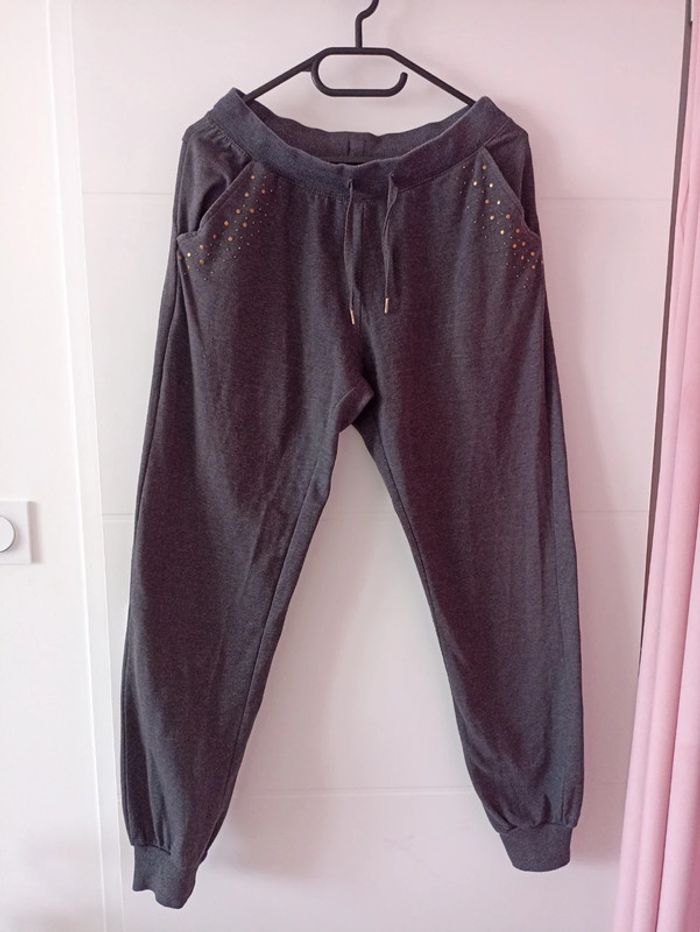 Bas de jogging femme: - couleur gris foncé - taille 38 - matière ; 60% coton, 40% polyester. - 2 poches - taille élastique plus cordon de serrage - resserré en bas des jambes - petits strass au niveau des poches - bon état