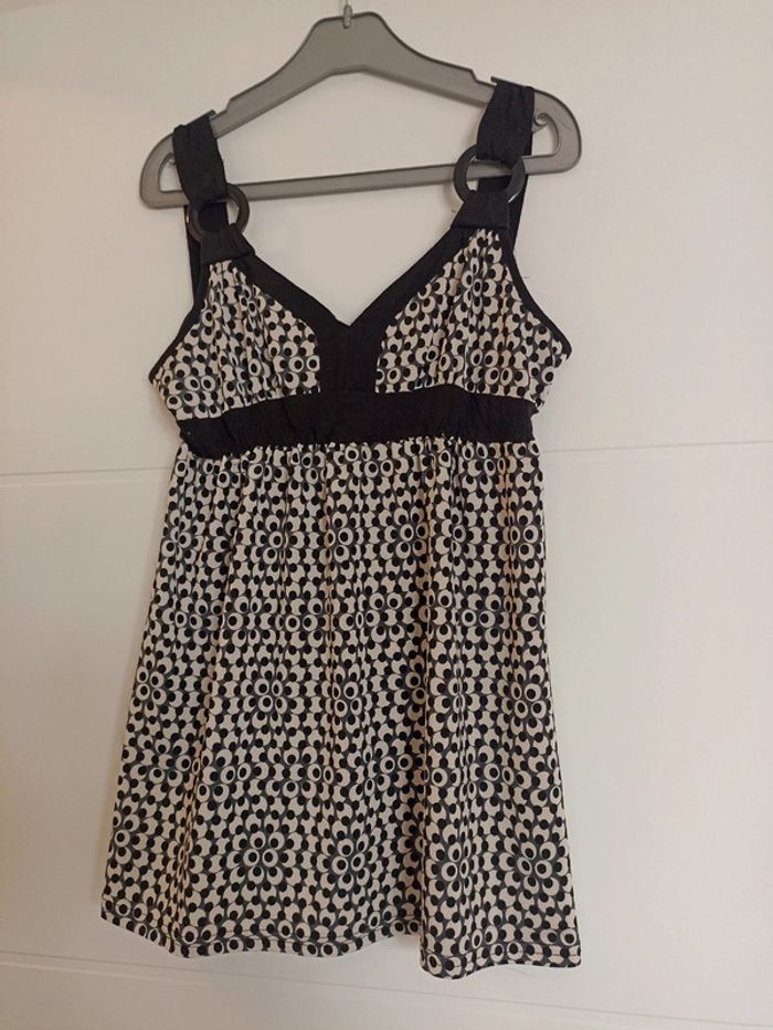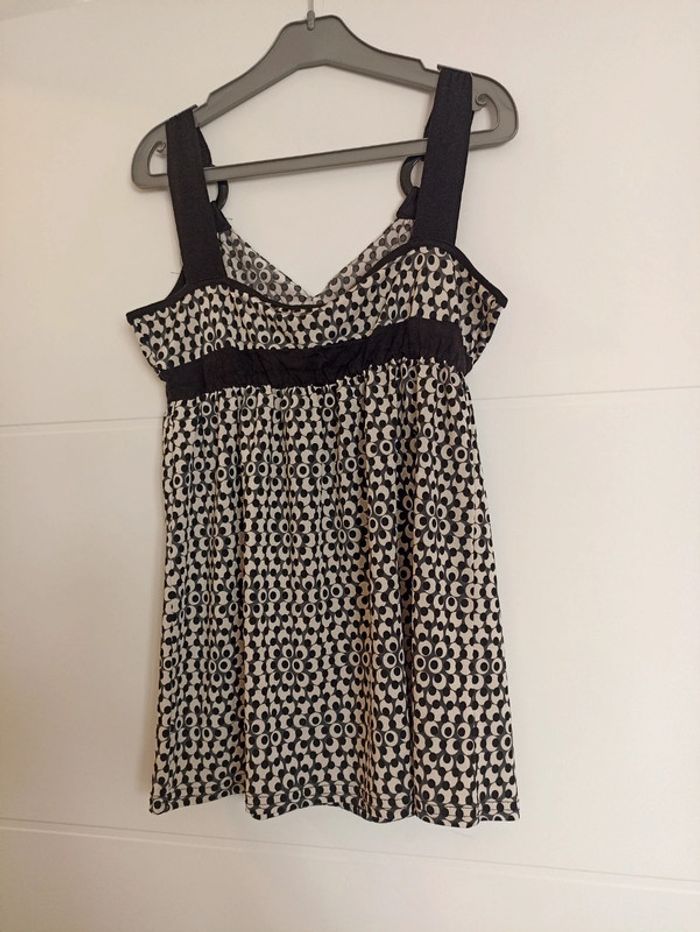 Tunique à larges bretelles, empiècement sous poitrine, coupe évasée,taille 2 (38/40), à motifs sur fond noir, en parfait état, marque Cache cache.