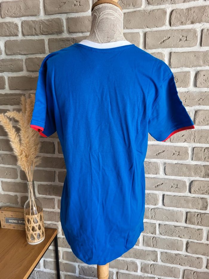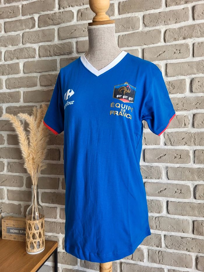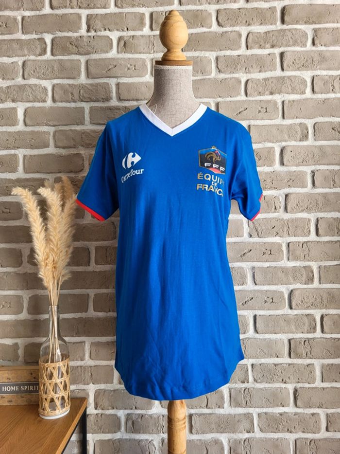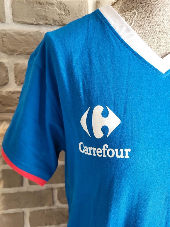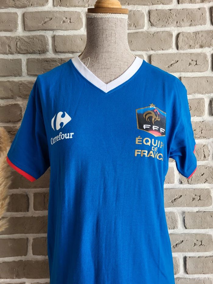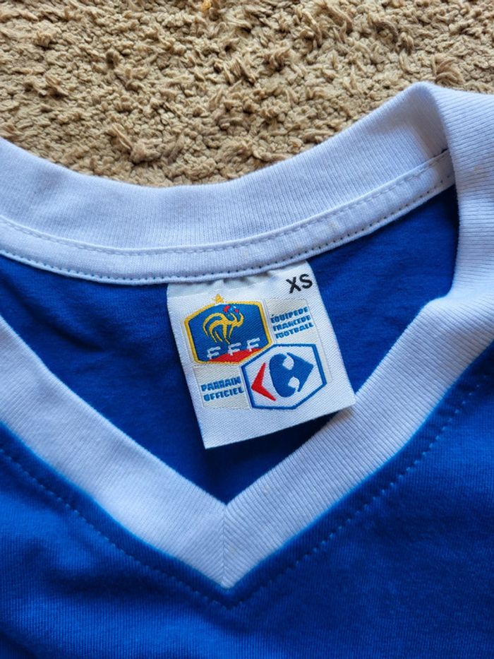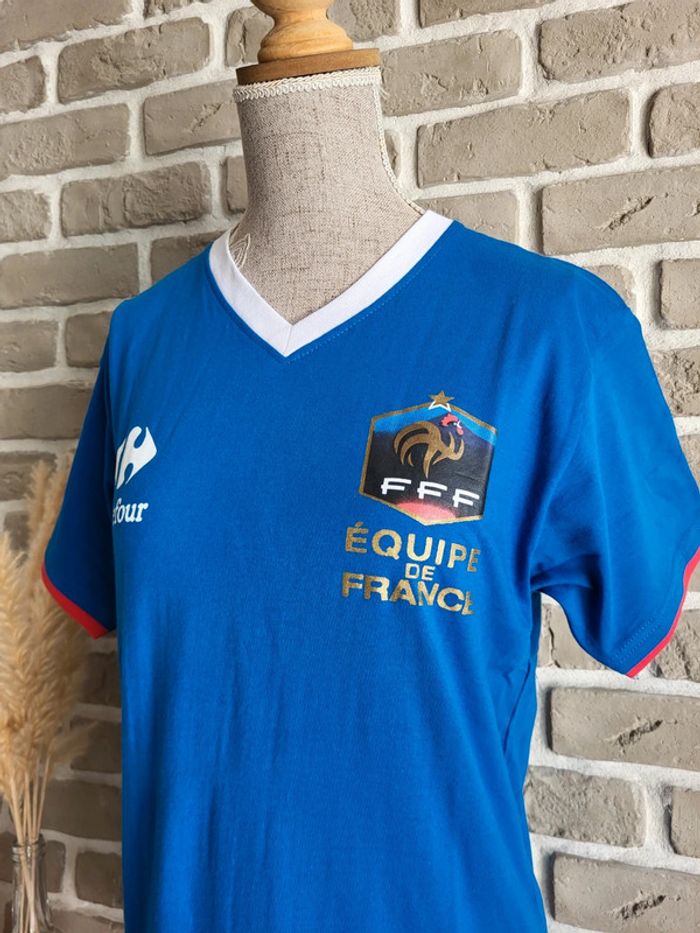 💝 Bénéficiez d'une réduction en créant lot dans mon dressing 🛍️ 🌸 T-shirt Carrefour FFF Equipe de France de Football neuf, jamais porté 🎀 En 100% coton bleu 🪷 Col en V bordé de blanc Manches courtes bordé de rouge Flocage poitrine en parfait état 🍥 Taille XS qui conviendra aussi à du S pour femme 🩷 Supporter l'équipe de France avec style en portant ce t-shirt Vintage et collector !