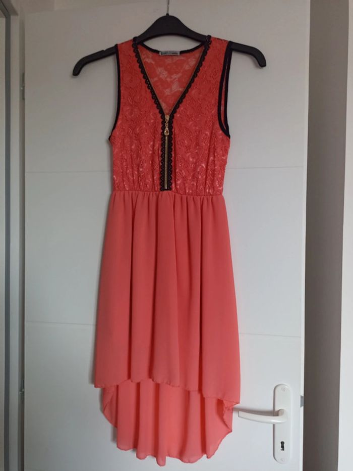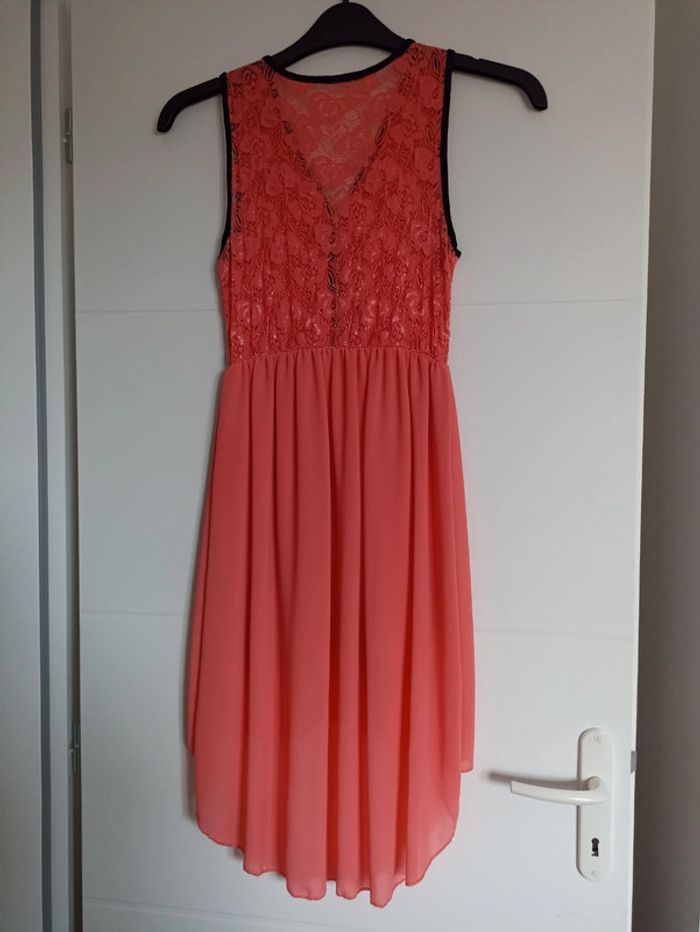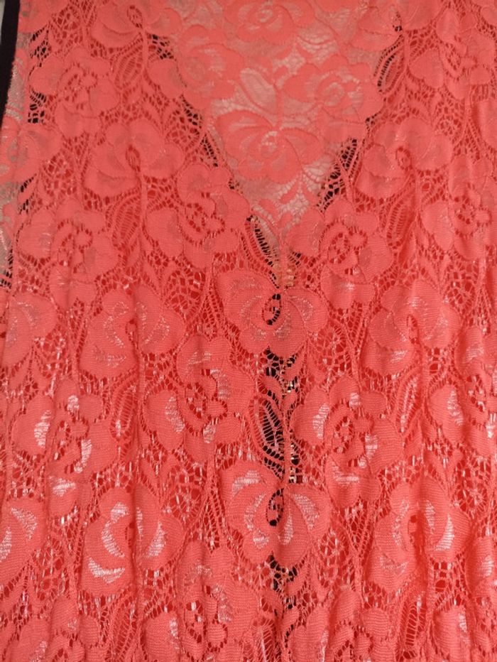 Très belle robe pour cocktail, cérémonie, de couleur corail, bustier en dentelle devant et dos, devant et bas de robe doublée, plus longue derrière, liseré noir autour des manches et devant du bustier, bustier avec fermeture éclair, portée une fois pour un mariage, 95% viscose, 5% élasthanne, taille unique (correspond à un 38/40).