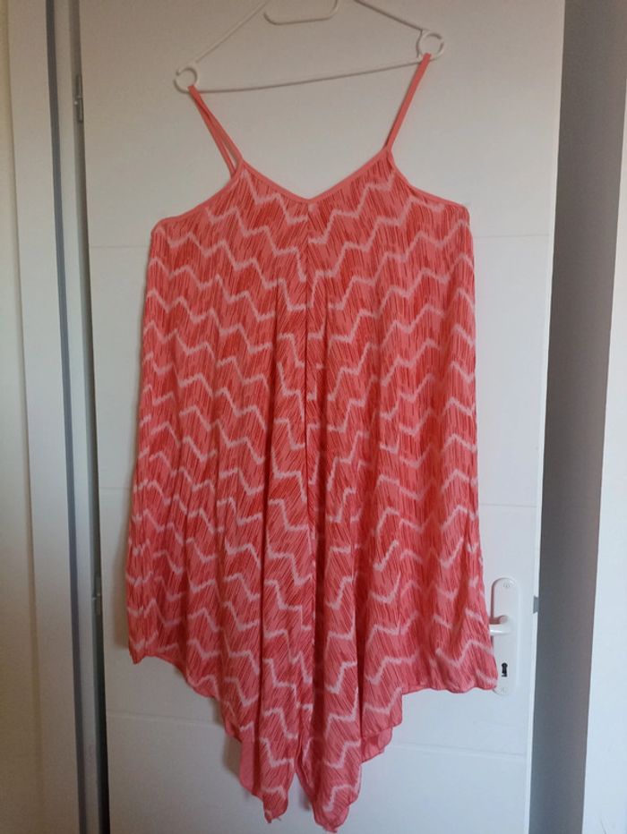 Vend robe été à fines bretelles, taille unique, à motifs, de couleur (corail, rouge et blanc), forme ample, 95% coton, 5% élasthanne, en parfait état.