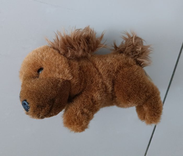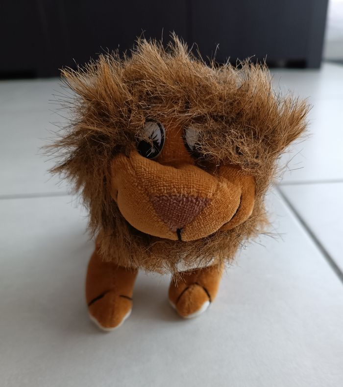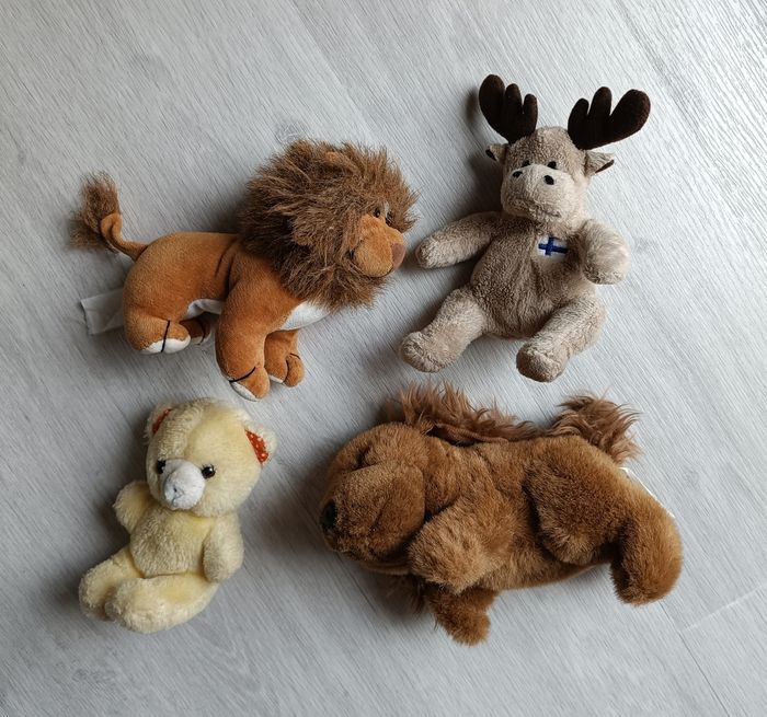 Bonjour, Vends un lot de 4 peluches : 🔷 Un petit chien couché (longueur environ 20cm) 🔷 Un renne (hauteur environ 15/16 cm) 🔷 Un lion (hauteur environ 15/16 cm) 🔷 Un ourson jaune (hauteur environ 13 cm) Très bon état.