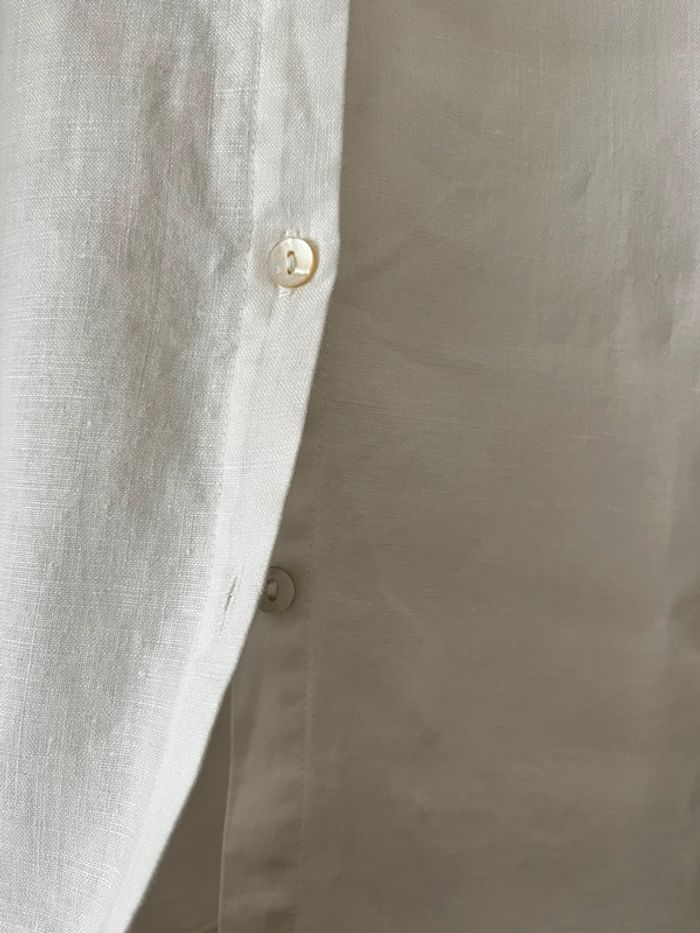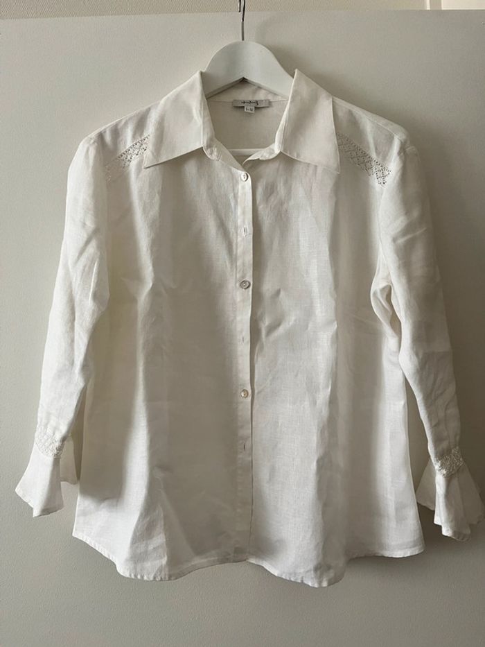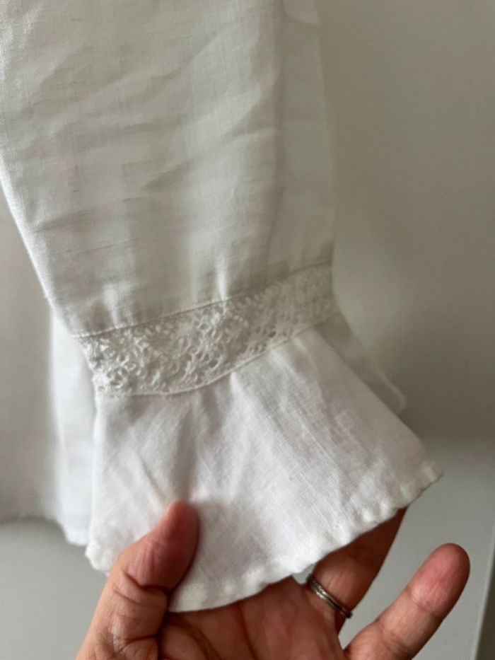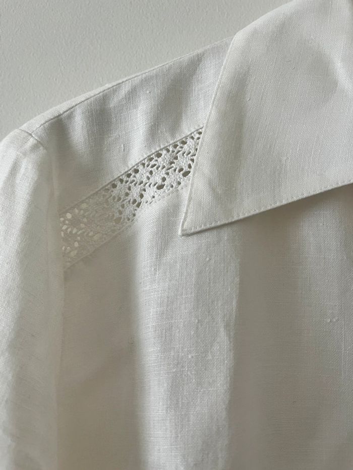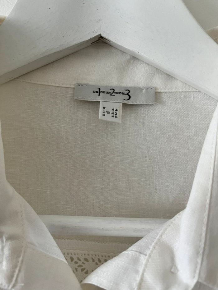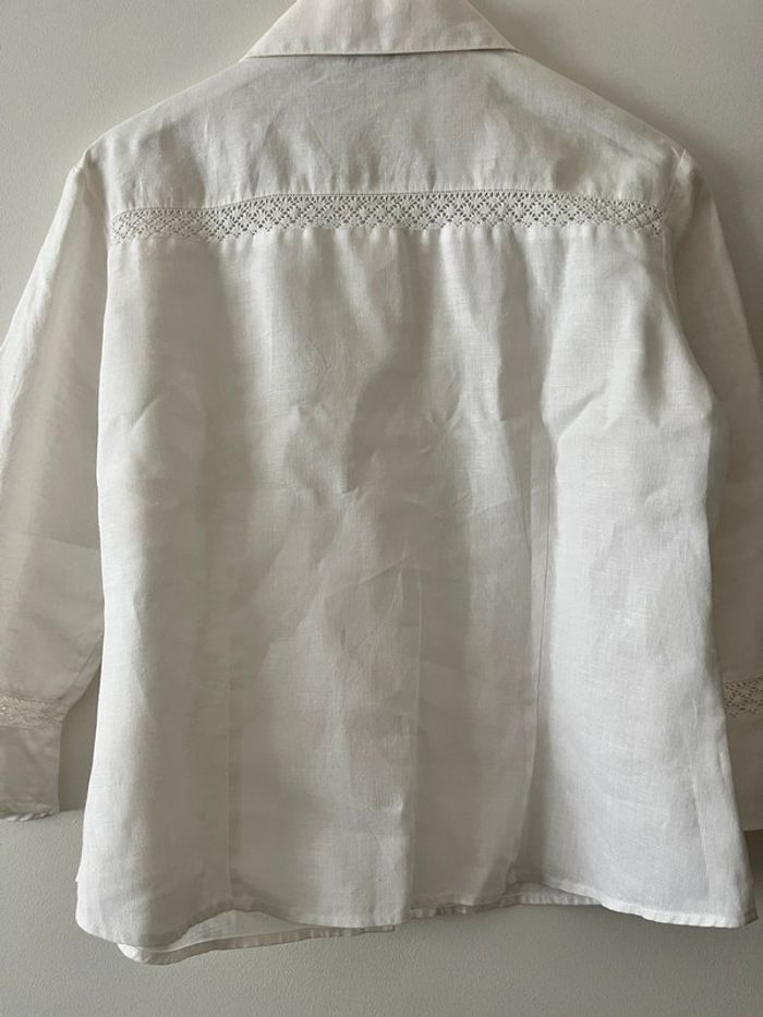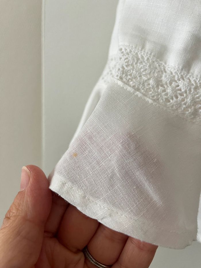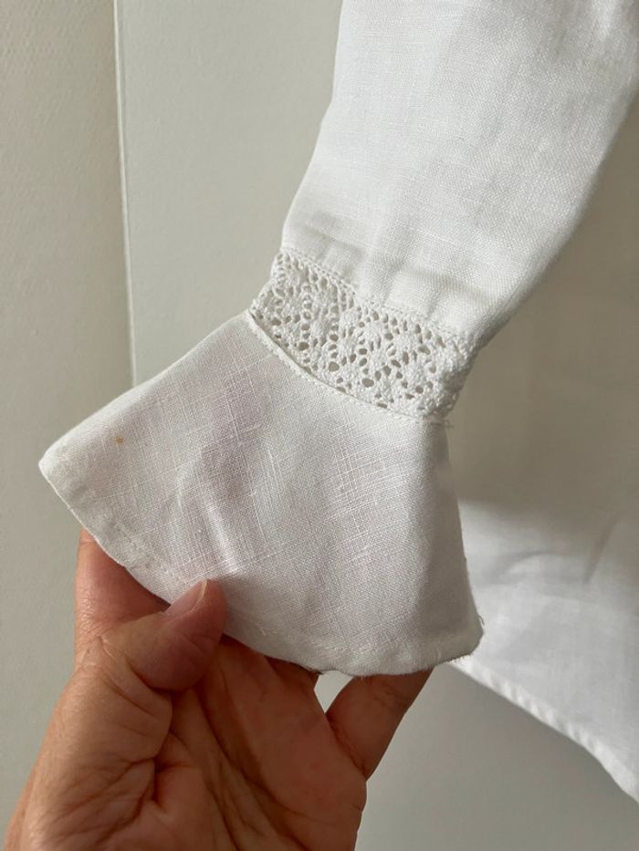 En très bel état ; seul défaut sur une manche (je n’ai pas essayé de faire partir ce point jaune) - voir photos 2 et 3. Manches 3/4 et détails broderie sur le chemiser 100 % lin