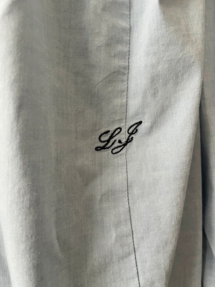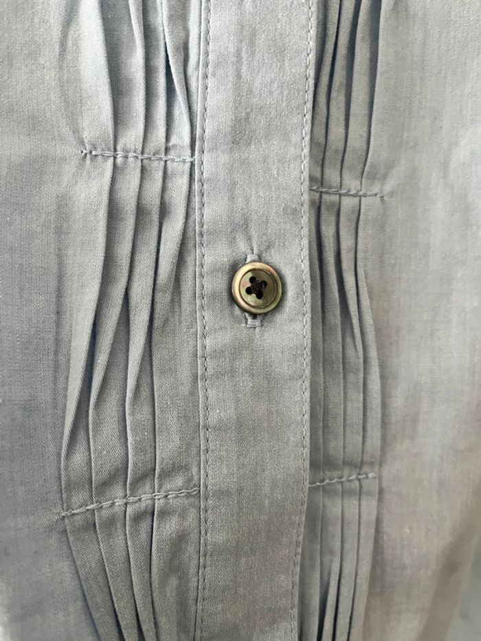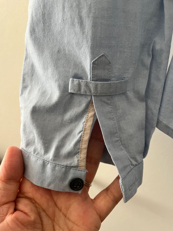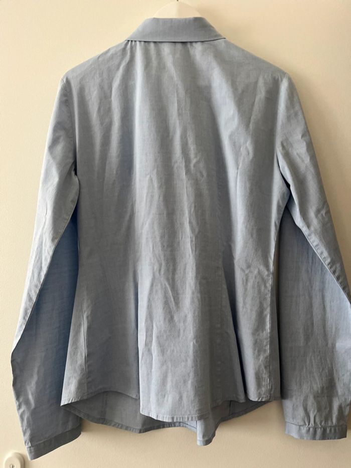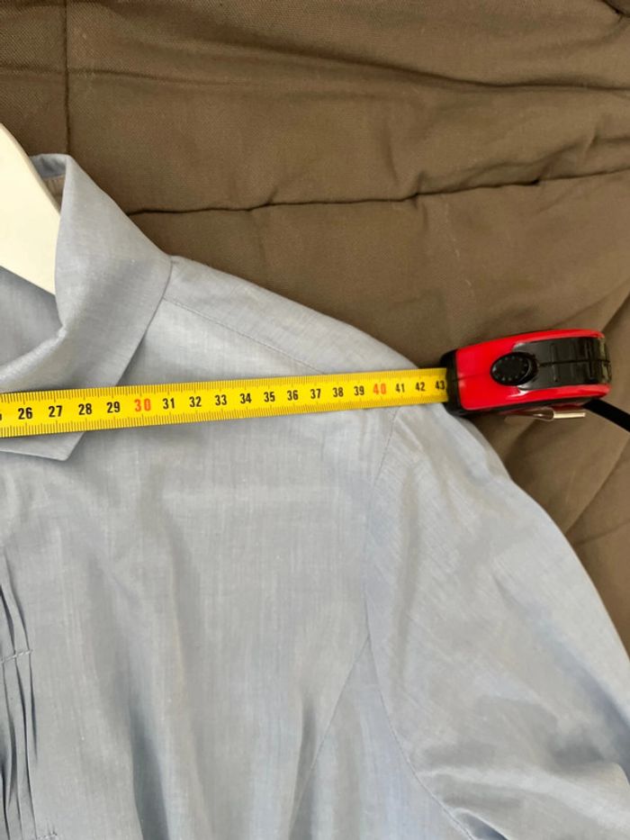 Très bon état Coloris bleu clair (le rendu est plus gris sur les photos : ATTENTION ce n’est pas le même coloris en vrai) Détails sur la partie boutonnage et aux poignets (voir photos) Coton/elasthane Taille indiquée : 48 mais semble tailler plus petit ; vérification des mesures nécessaires. Longueur épaule à épaule prise à partir des coutures Longueur de haut en bas prise à partir du milieu de l’épaule