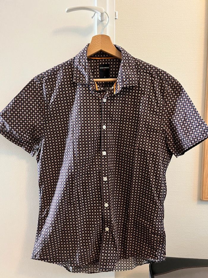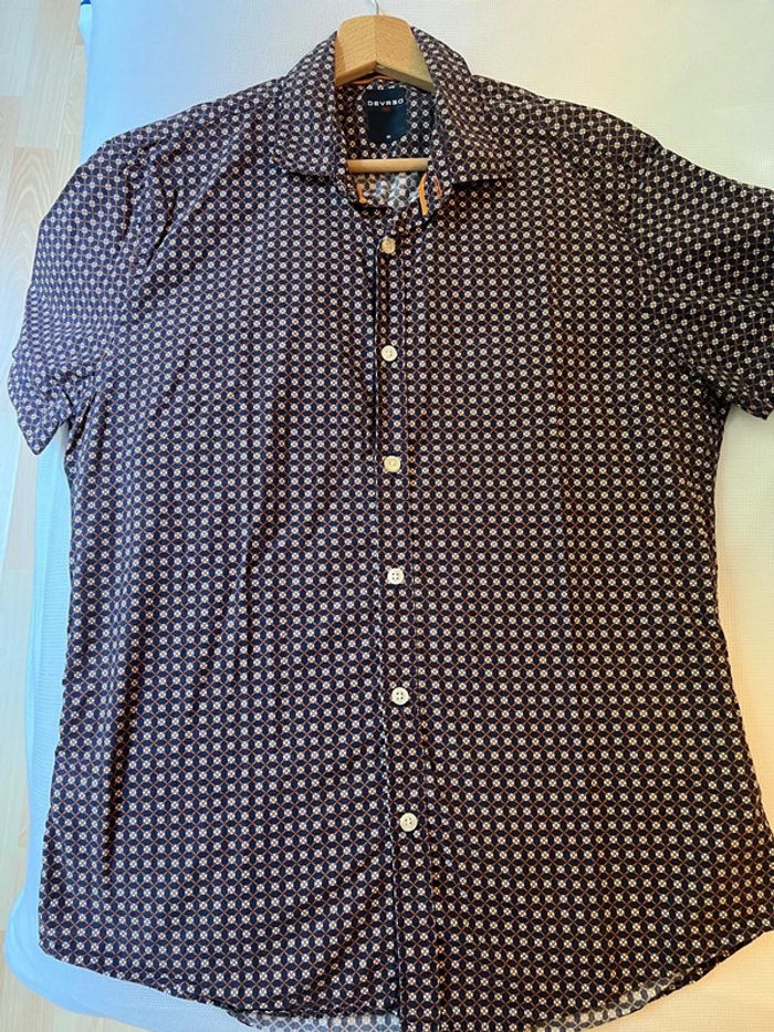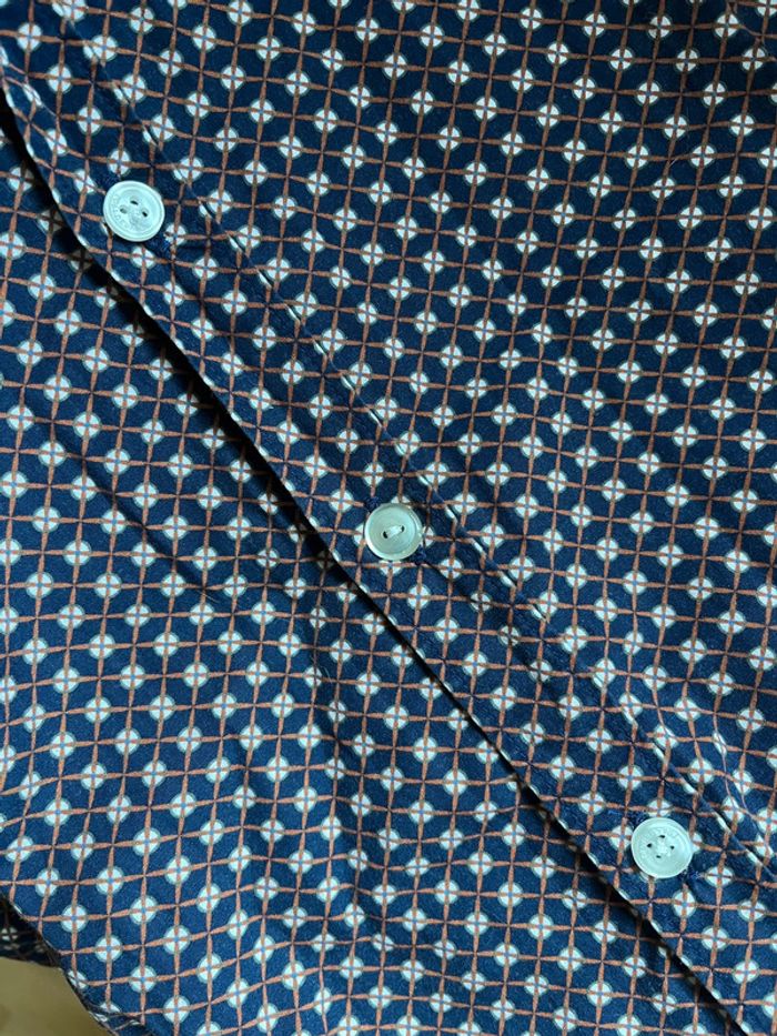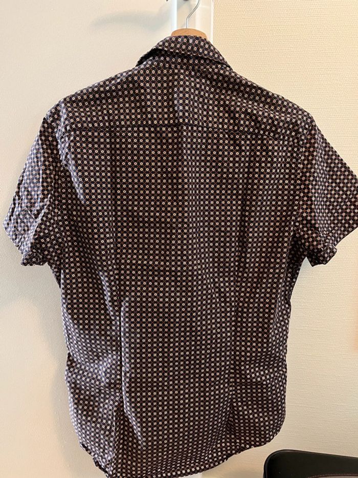 À motifs En très bon état (seul « défaut » : un chgt de bouton mais invisible à l’œil nu) MC Taille indiquée : M mais modèle « fit » près du corps donc plutôt un petit M Voire S 52 cm d’aisselle à aisselle 42 cm épaule à épaule Environ 65 cm du col en bas