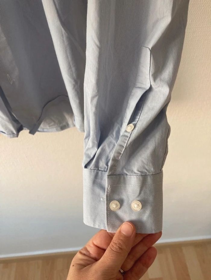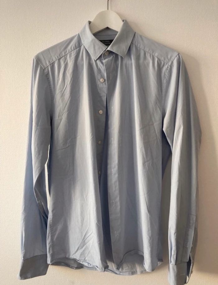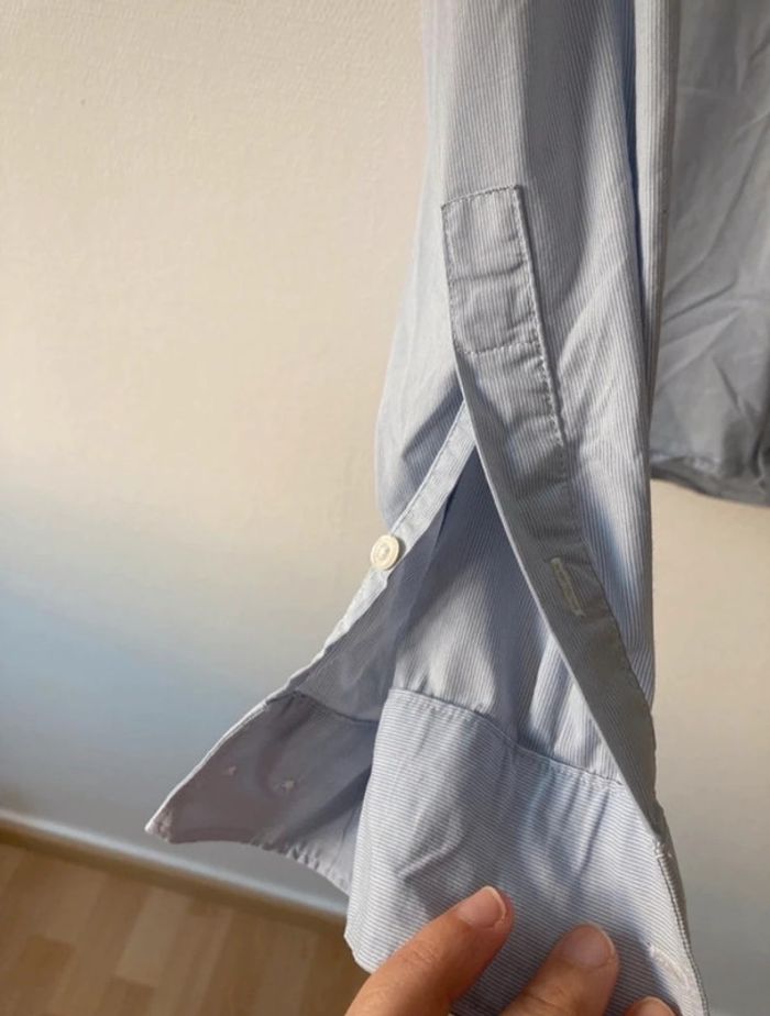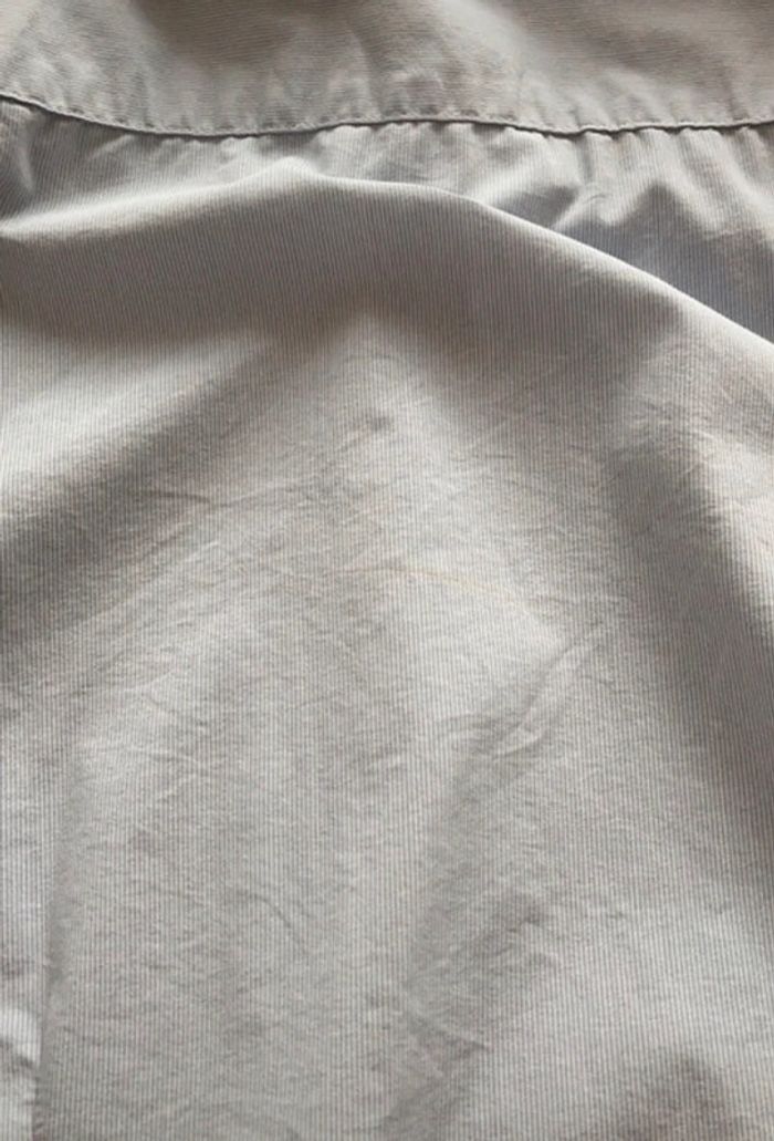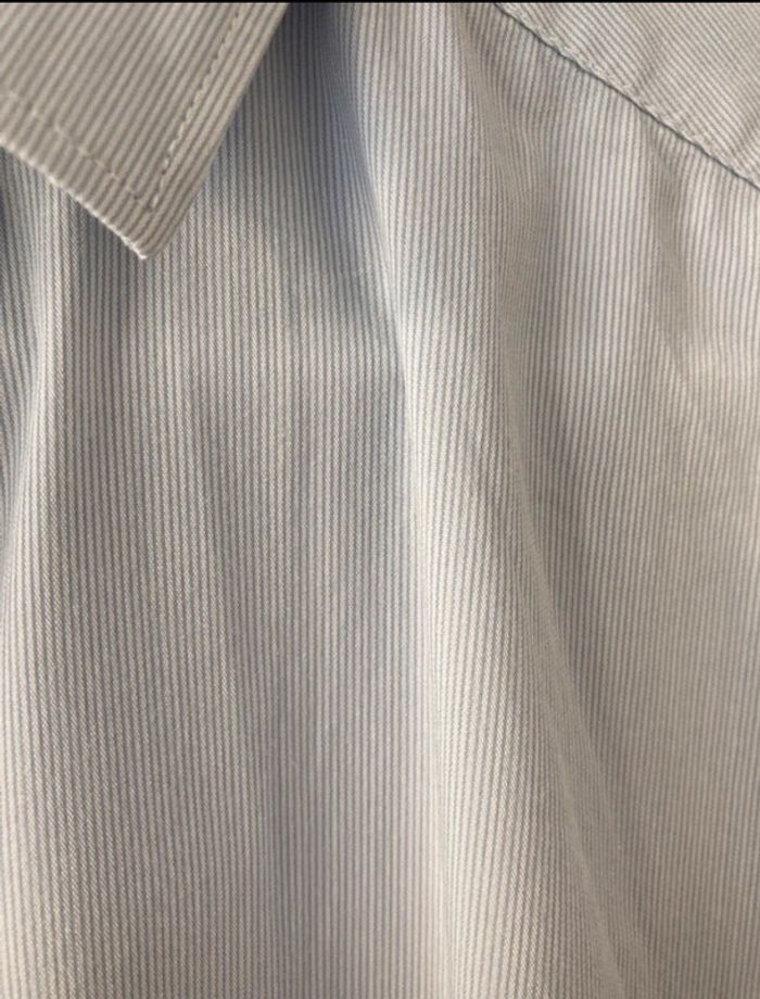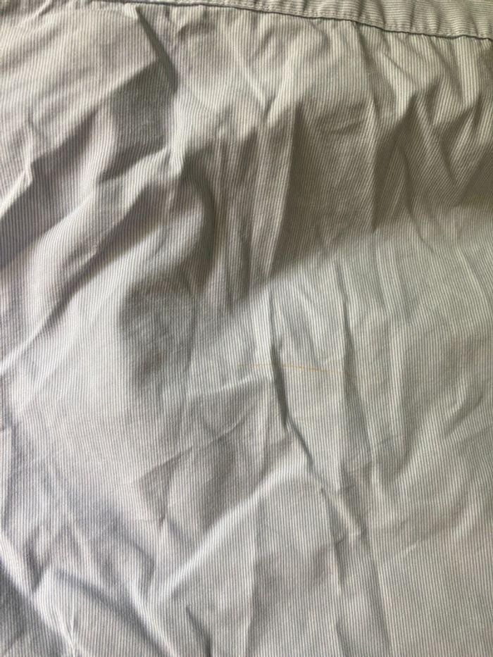 Chemise homme mais peut convenir pour une femme. Taille correspond davantage à un M Un défaut mis en évidence sur la dernière photo : un trait orangeatre , peu visible néanmoins.