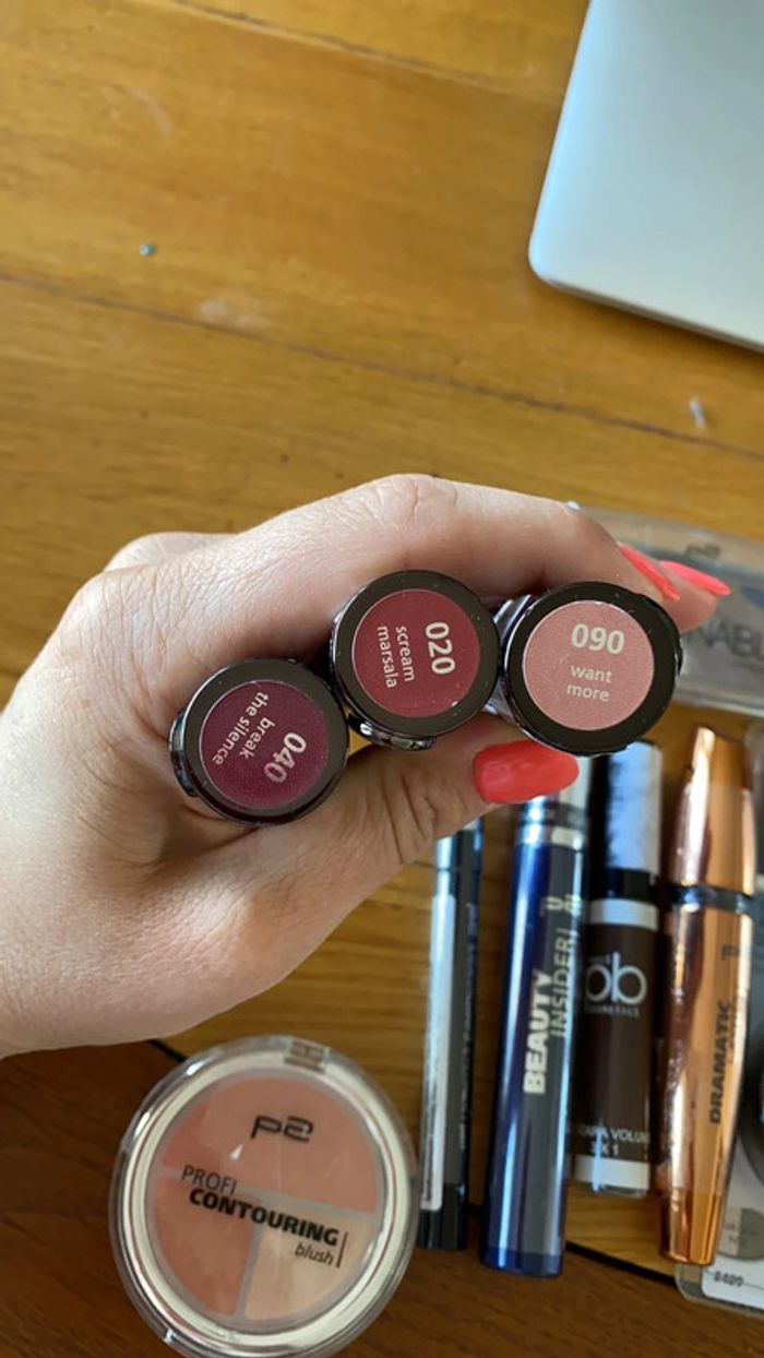 Neuf 11 pièces 3 rouge à lèvres 1 palette phare à paupières 1 blush 1 khol -VENDUE 1 ombre à paupières duo 1 ombre à paupières mono 1 yeliner 3 mascara ( 2 noir, marron)