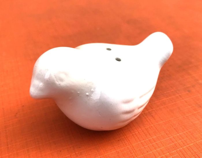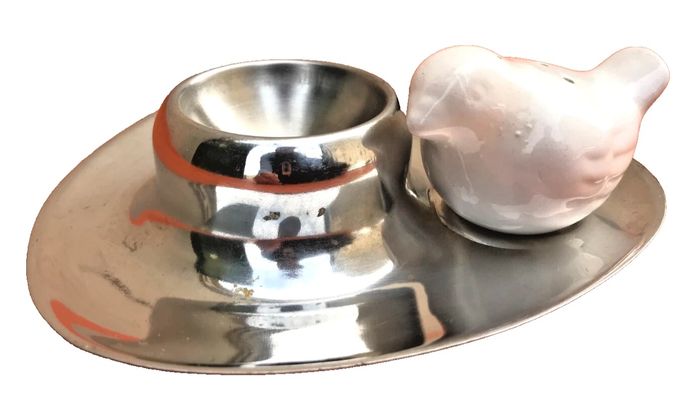 Années 1960 Space Age Design Coquetier métal forme triangulaire Salière céramique blanche forme oiseau Coquetier : Longueur : 120mm Largeur :105mm Hauteur : 20mm Salière : Longueur : 55mm Largeur : 35mm Hauteur : 30mm Poids de l' ensemble : 70grs
