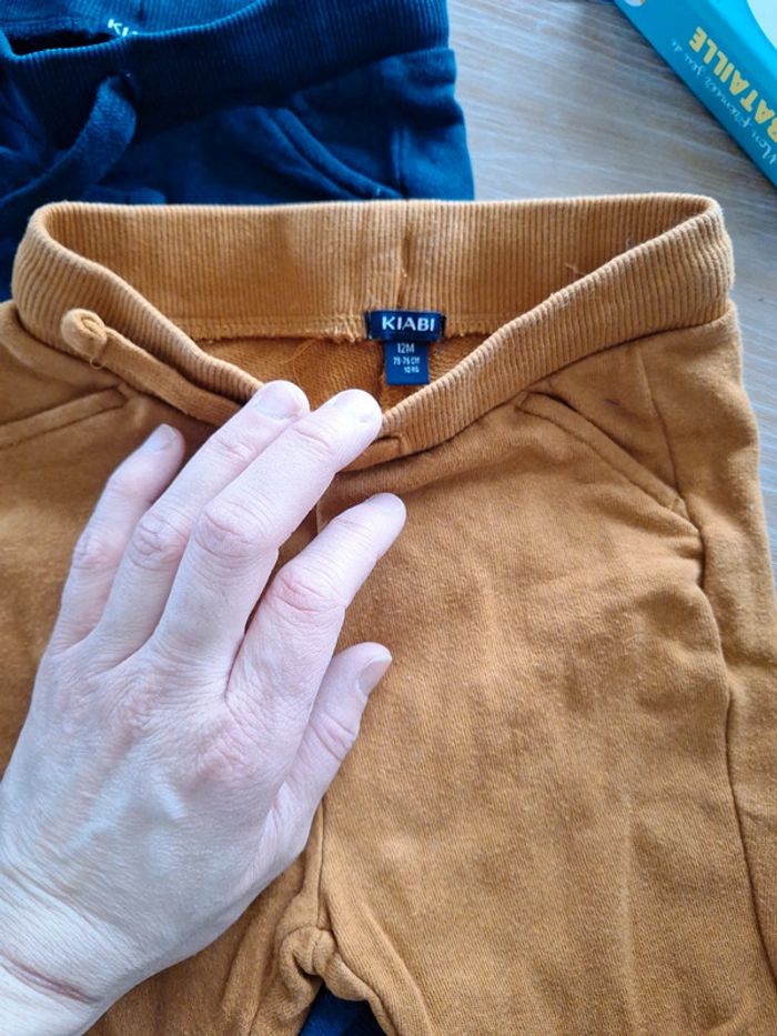 2 joggings garçon KIABI taille 12 mois en bon état ! Ne sont pas tachés ni déchirés mais on pas mal servis car j'ai 3 garçons mais peuvent être encore portés.