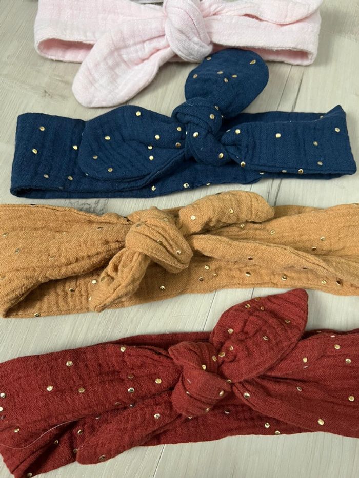 Lot de 6 bandeaux créatrice neufs ! Tissus pois doré. Créatrice : Les Créations De Maman. Jamais portés. Ils mesurent tous entre 70 cm et 72 cm de longueur. Le noeud peut être fait de façon plus joli. Et le tissus est assez élastique, donc on peut faire un plus gros noeud pour que le bandeau soit plus serré sur la tête.