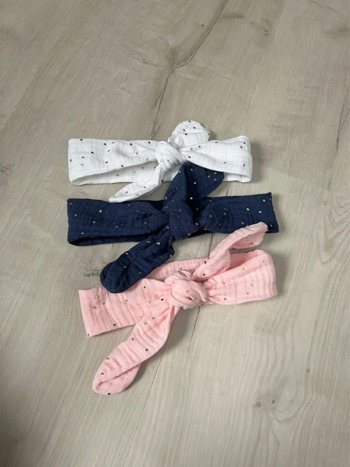 Lot de 3 bandeaux créatrice neufs ! Tissus pois doré. Créatrice : Les Créations De Maman. Jamais portés. Ils mesurent : entre 73-75 cm pour le blanc ; 93 cm pour le bleu ; et 83 pour le rose (de longueur). Le noeud peut être fait de façon plus joli. Et le tissus est assez élastique, donc on peut faire un plus gros noeud pour que le bandeau soit plus serré sur la tête.