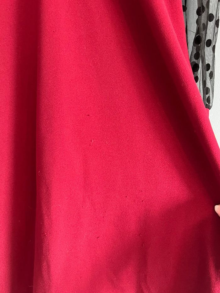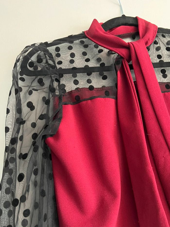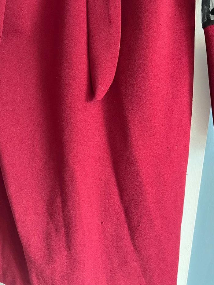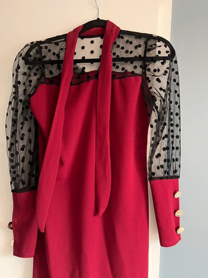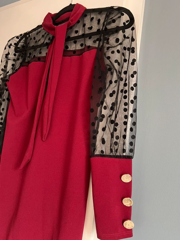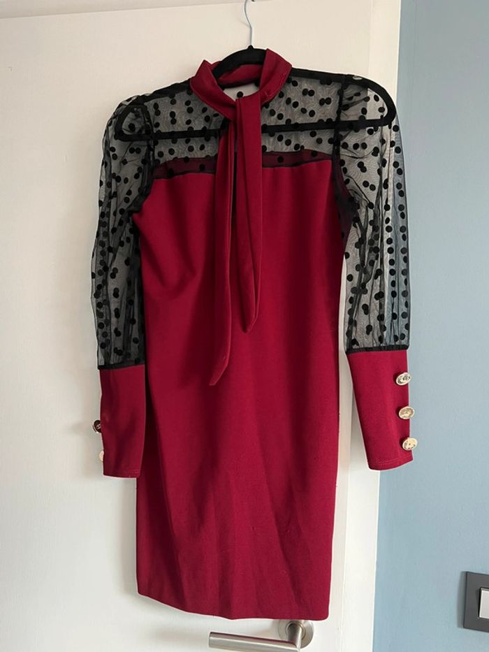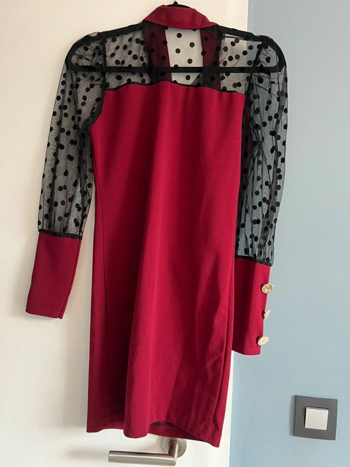 Robe bordeaux à nouer au cou. Avec voile aux manches et boutons. Taille S. Quelques fils tirés sur le devant et sur l’arrière (voir photos) mais c’est discret et ça ne choque pas.