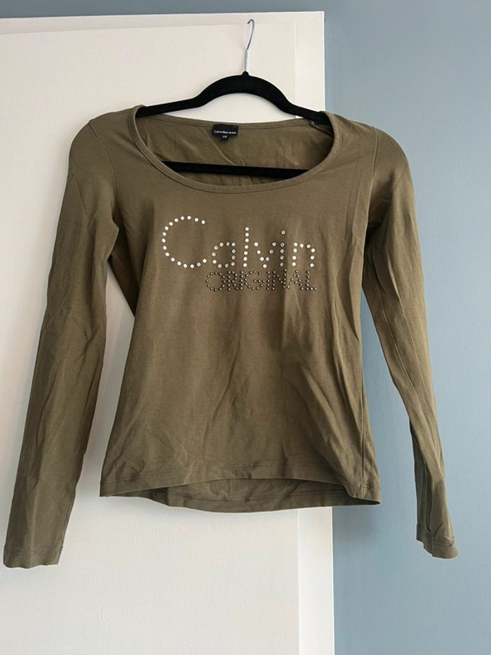 Blouse authentique Calvin Klein couleur kaki. Taille XS. Très bon état, il manque juste un brillant au dos de la blouse. Voir photos.