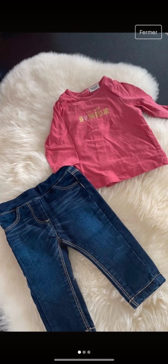 Ensemble jeans et blouse tape à l’œil « Mon petit bonheur ». Taille 6 mois 68 cm Possibilité de vendre séparément. Excellent état. Il y a juste le prénom écrit au bic sur l’étiquette intérieure de la blouse. (Très discret mais il suffit de la couper. Je ne le fais pas pour que vous voyez la taille de la blouse).