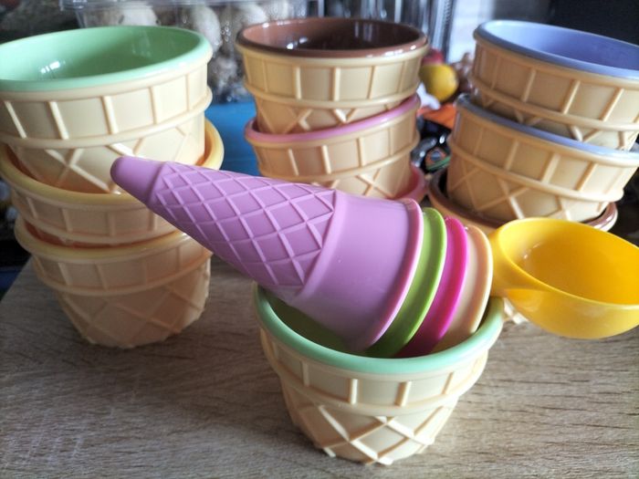 Lot pots et cornets a glace Très bon état Couleur jaune , marron , pistache , rose et bleu Lot comprenant : 10 coupelles a glace , 4 cornets et une cuillère Matière plastique 12€ ferme