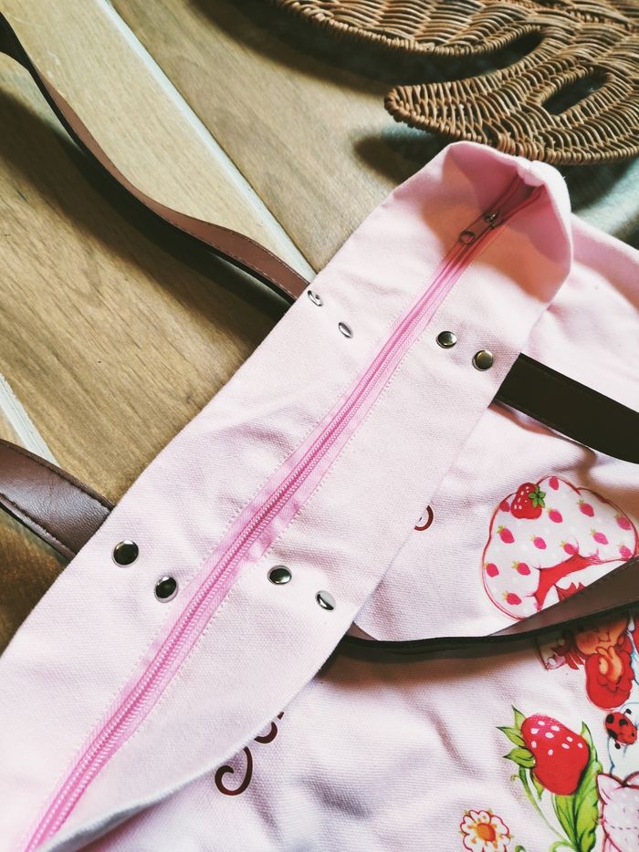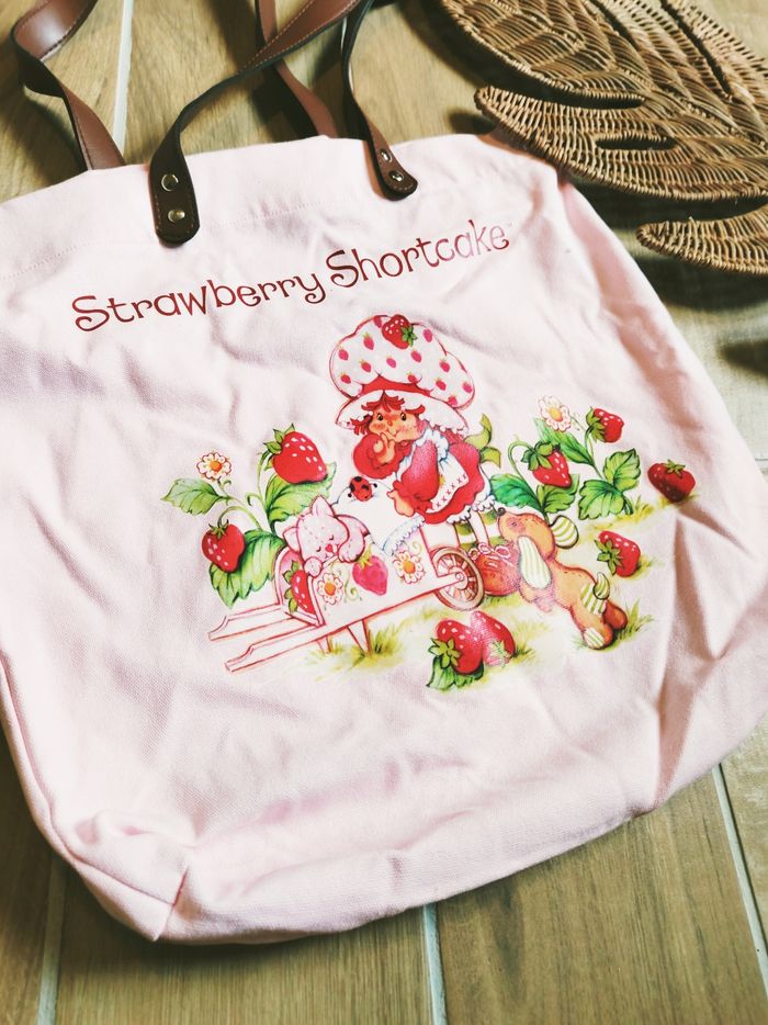 🍓Grand Sac cabas rose en coton Charlotte aux fraises 🎀Anses en simili cuir 🎀Fermeture éclair ❇️N'hésitez pas à créer un lot pour économiser sur les frais de port❇️ Figurine vintage, Poupée vintage, Petite poupée, Sarah Kay, Strawberry shortcake, Dolls, Tarta de fresa