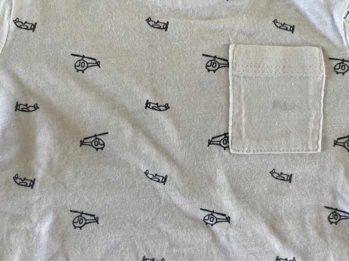 Salopette en jean bleu + tee-shirt manches longues blanc à motifs avions et hélicoptères.