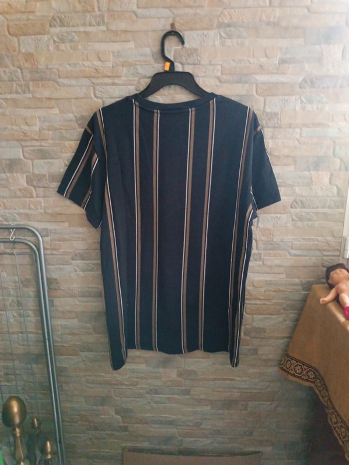T-shirt marine à rayures kaki/blanc. Bershka 40. Épaules 48 cm, aisselles 54 cm, longueur 70 cm. Coton. Neuf.