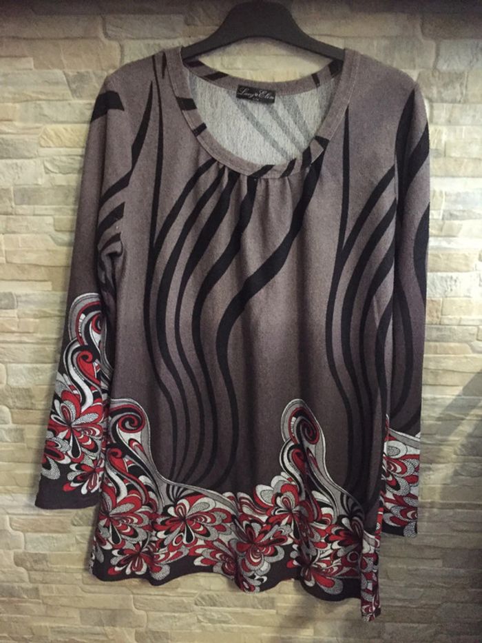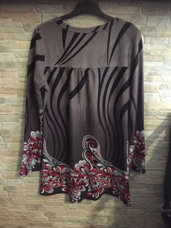 Tunique Lusy & Elisa, taille S/M, longueur 78 cm, largeur épaules 38 cm, largeur aisselles 50 cm, marron/noir/gris /bordeaux - 65% coton, 30% polyester, 5% élasthanne - TBE