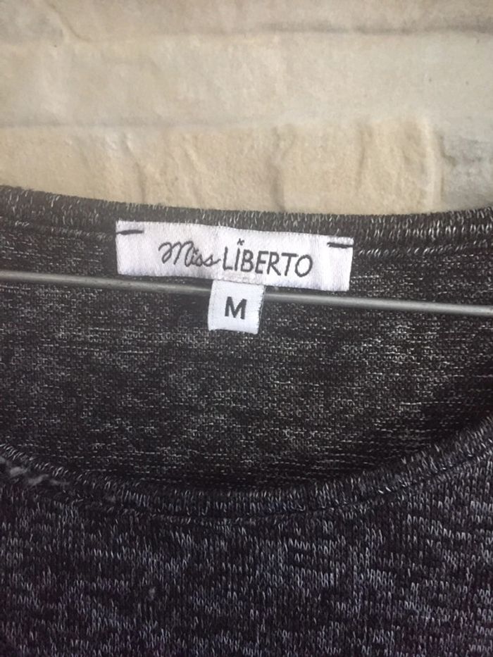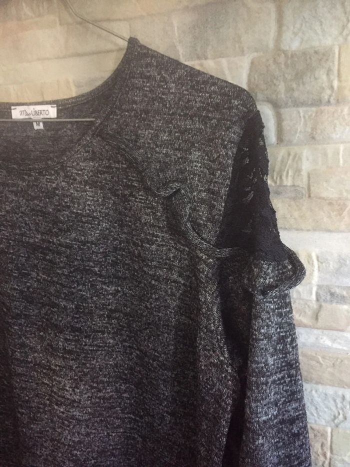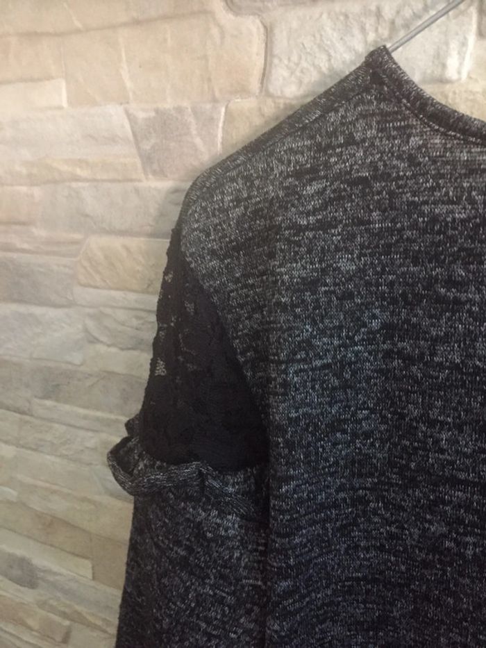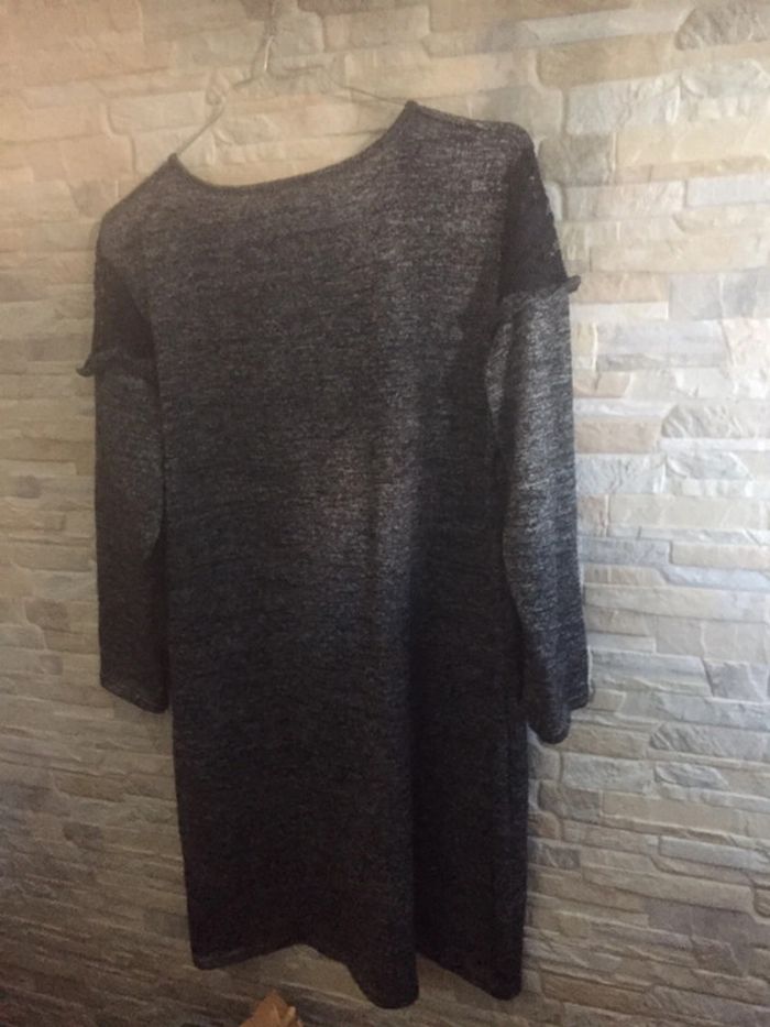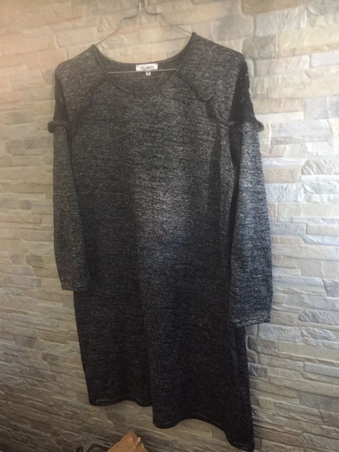 Robe chiné noir Miss Liberto, taille M/38, longueur 80 cm, largeur épaules 42 cm, largeur aisselles 48 cm, dentelle noire aux épaules, longueur manches 48 cm, coton polyester - TBE