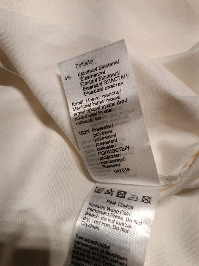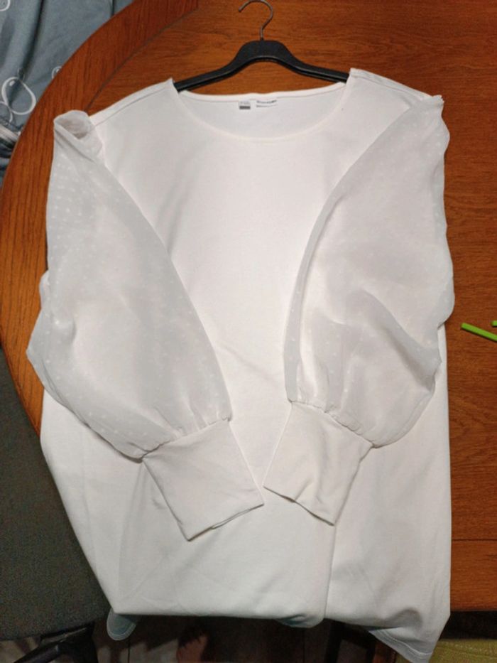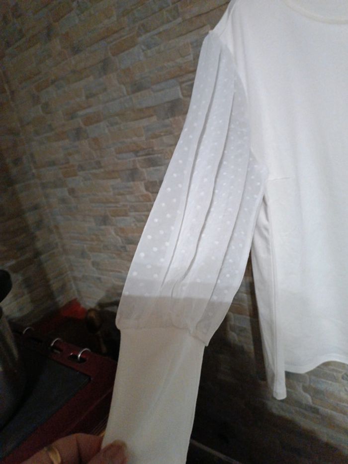 Blouse crème Bodyflirt 50, épaules 50 cm, aisselles 60 cm, longueur 74 cm, manches blanches en tulle à pois 60 cm, 68% viscose, 28% polyester, 4% élasthanne. Jamais porté. Neuf