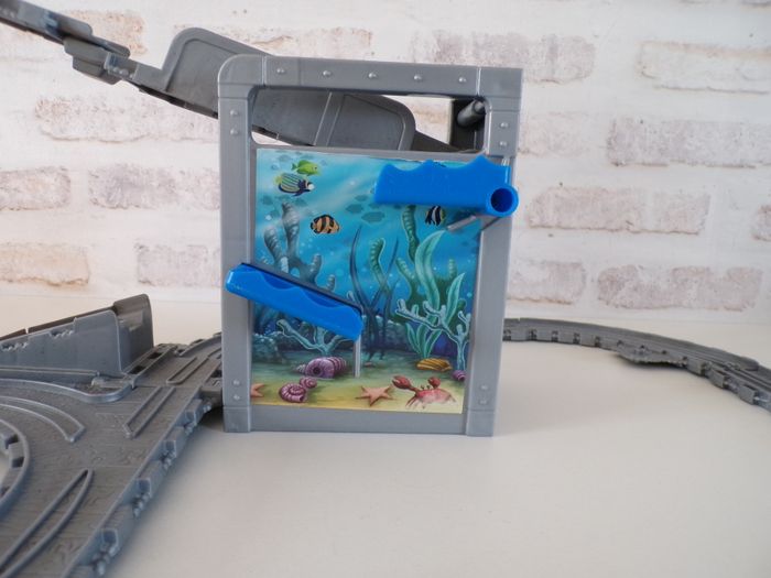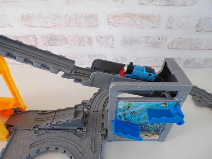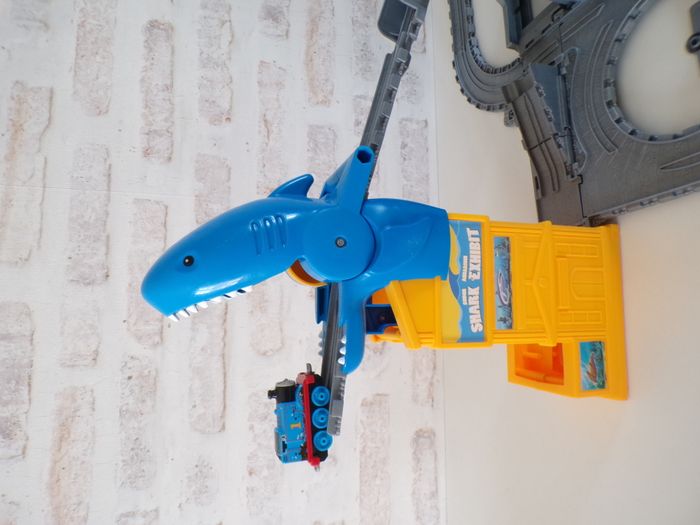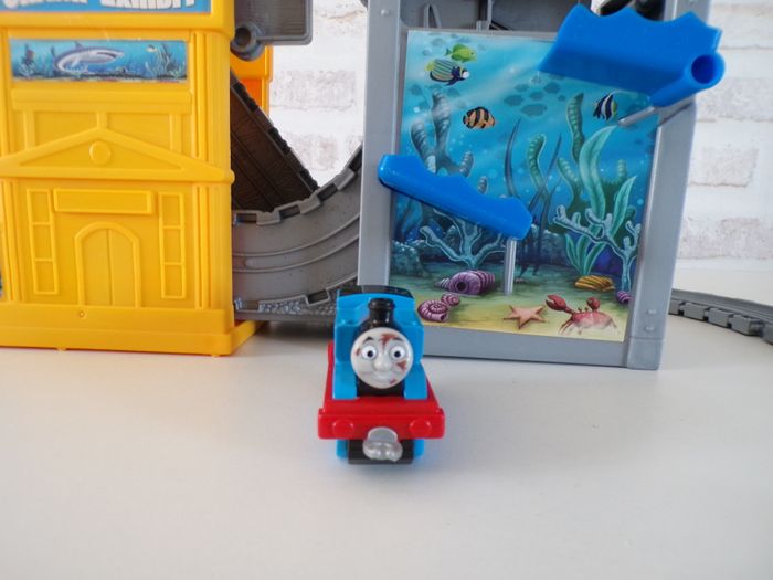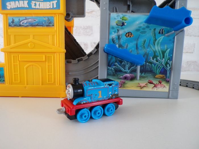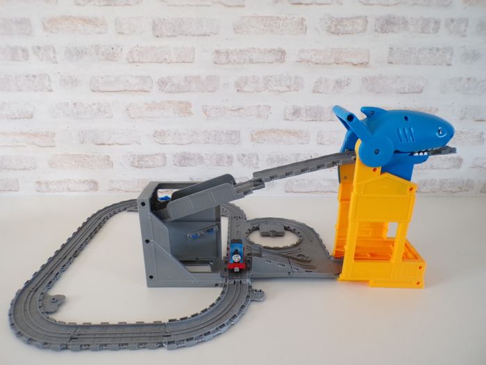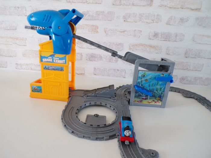 Circuit de train requin - Thomas et ses amis, Thomas and friends, Thomas & ses amis, tren, trenini, trein, zug, en super bon état, et complet, des rails ont été rajoutés. La locomotive s'appelle Thomas, en bon état. Se replie facilement afin de prendre peux de place et se transporte partout.
