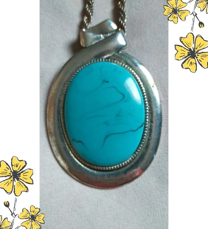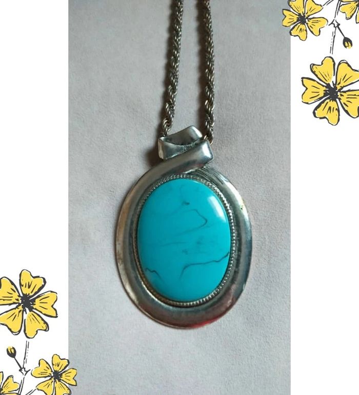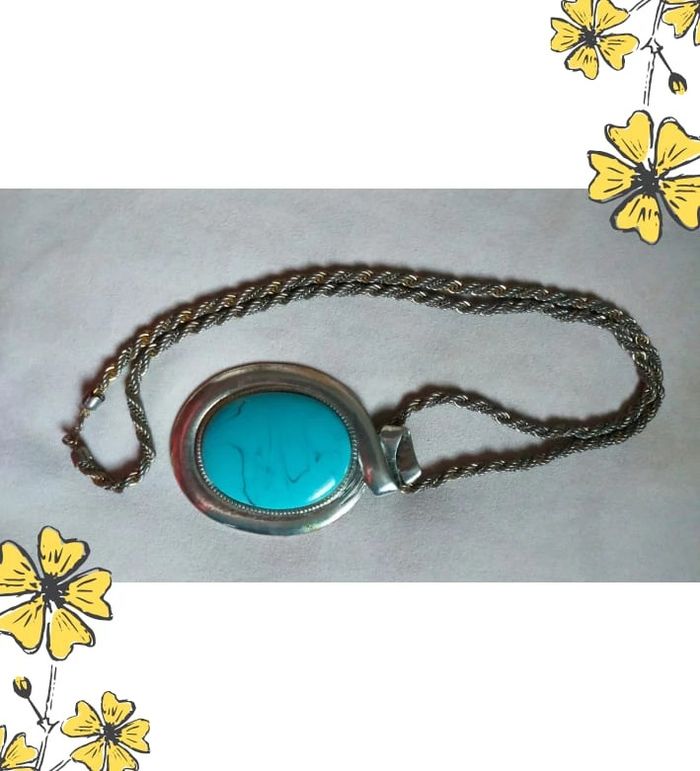Superbe collier vintage avec une chaîne torsadée en métal argenté patiné, et un grand pendentif ovale orné d’une pierre turquoise synthétique façon howlite. Style affirmé, bohème ou rétro chic selon les tenues. Pièce rare, très élégante ! 💎 Matières (probables) : Chaîne en métal argenté (non précieux), pendentif en métal argenté + pierre synthétique turquoise façon howlite. 📏 Longueur chaîne : environ 70 cm 📍État : Très bon état vintage – quelques traces discrètes d’usage sur le métal (voir photos) 📦 Envoi rapide & soigné. Possibilité d’envoi en lot ou petit cadeau surprise pour les commandes multiples ! LBVIN2 #collier #colliervintage #collierlong #turquoise #boho #bohochic #bijouxfantaisie #vintageaddict #statementnecklace #pendentifturquoise #chaineargentée #bijourétro #bijouoriginal #bijouxfemme #vintedbijoux