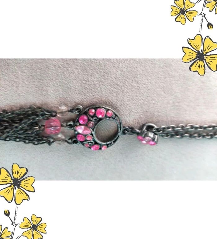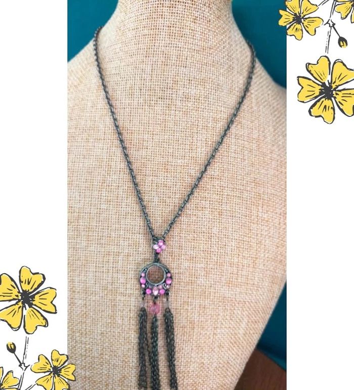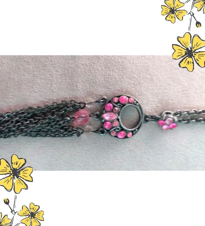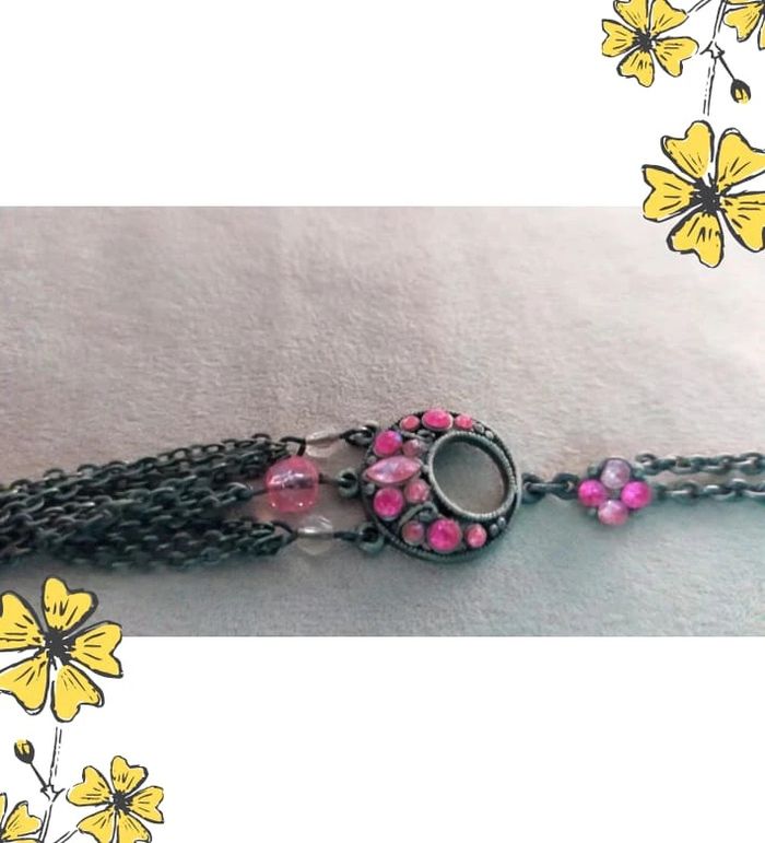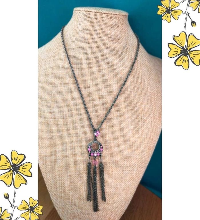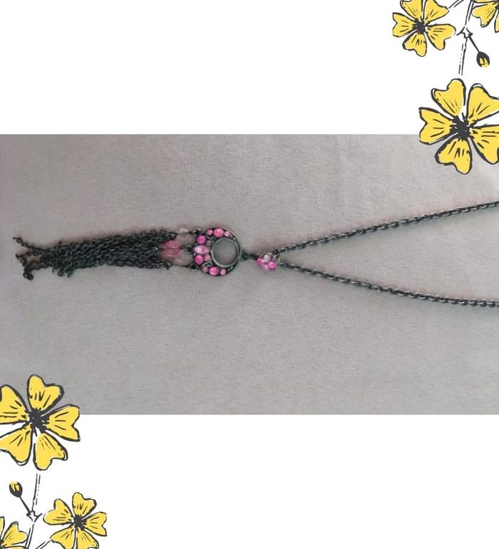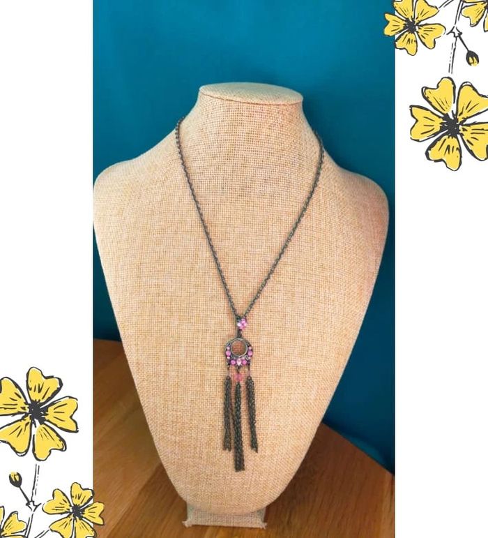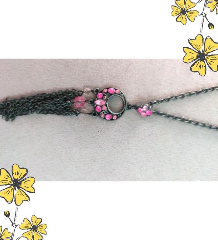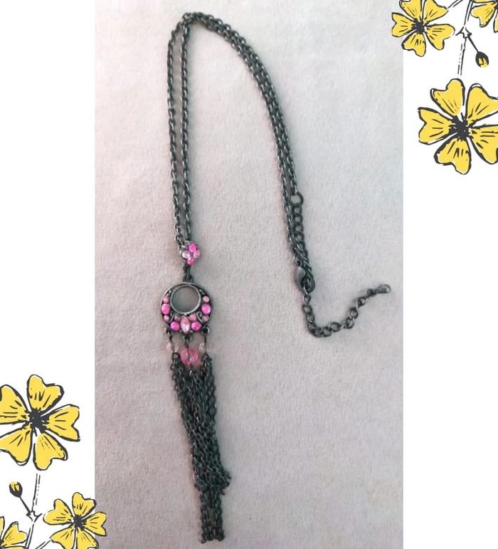 Collier vintage délicatement travaillé, composé d’une chaîne en métal gris vieilli, agrémentée d’un pendentif central en forme de cercle orné de strass roses et perles transparentes. Trois pampilles en chaînes fines tombent du médaillon, apportant mouvement et originalité à la pièce. Un petit motif floral en perles roses rehausse la partie supérieure du pendentif. Ce bijou au style bohème chic peut aussi bien se porter avec une tenue romantique qu’avec un look plus rock ou rétro. Parfait pour ajouter une touche de couleur et d’élégance à votre tenue. 🔸 État : Très bon état vintage 🔸 Longueur : env. 47 cm (chaîne) + pendentif de 9 cm 🔸 Fermoir : mousqueton 🔸 Couleurs : gris vieilli, rose, transparent 🔸 Matières : métal, strass, perles synthétiques 💡 Idée cadeau originale pour les amoureuses de bijoux vintage ou de style bohème. L10V #colliervintage #bijouvintage #collierfantaisie #bijourose #collierbohème #stylebohochic #bijouromantique #bijouancien #pendentifstrass #pampillechaîne #collieroriginal #vintedbijoux