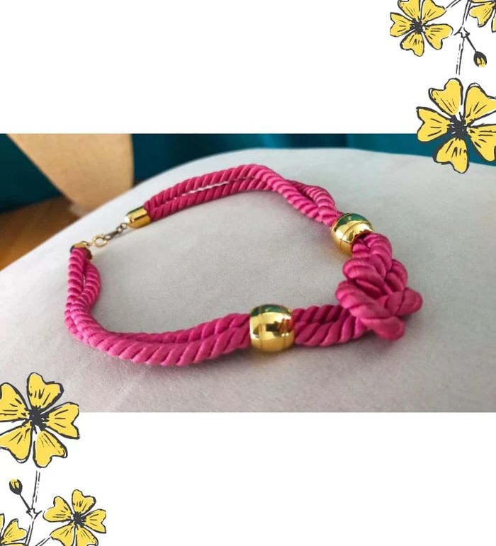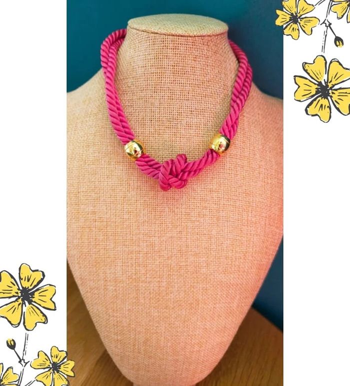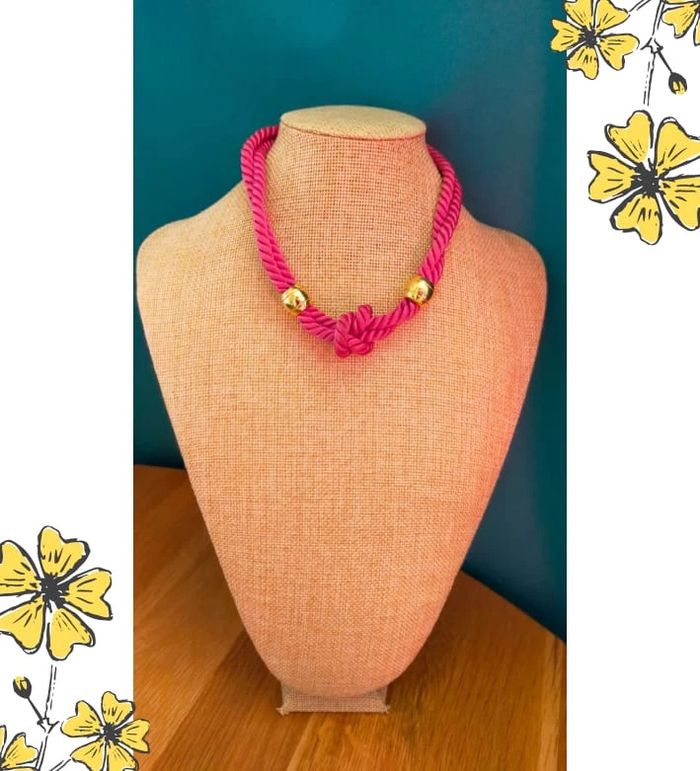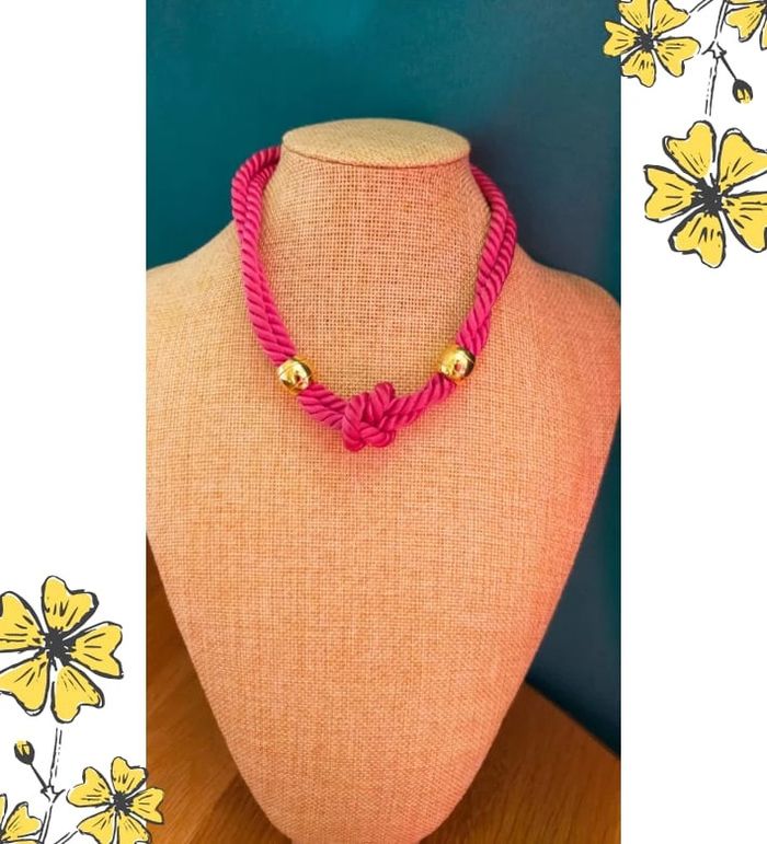 Collier vintage fantaisie, pièce originale de la Collection Nuances de Rose. Modèle audacieux avec un cordon torsadé rose fuchsia et un nœud central chic, souligné de perles dorées brillantes. Ce bijou au look rétro rappelle les tendances statement des années 80/90. 🔸 État : Très bon état 🔸 Style : Rétro – Tendance – Audacieux 🔸 Fermoir : Anneau à ressort 🔸 Longueur portée : Ras du cou / collerette 🔸 Matériaux : Cordon synthétique + éléments métalliques dorés 🔸 Collection : Nuances de Rose 💖 Idéal pour rehausser une tenue unie ou pour un look assumé et original ! 💌 Je soigne l’envoi & l’emballage. Envoi rapide. 🎁 Possibilité d’envoi en lot ou petit cadeau surprise pour les commandes multiples ! L9V #collier #bijouxvintage #collierfantaisie #vintageaddict #modevintage #bijourose #collierrose #collieroriginal #statementnecklace #nuancesderose #bijouxtendance #bijouxretro