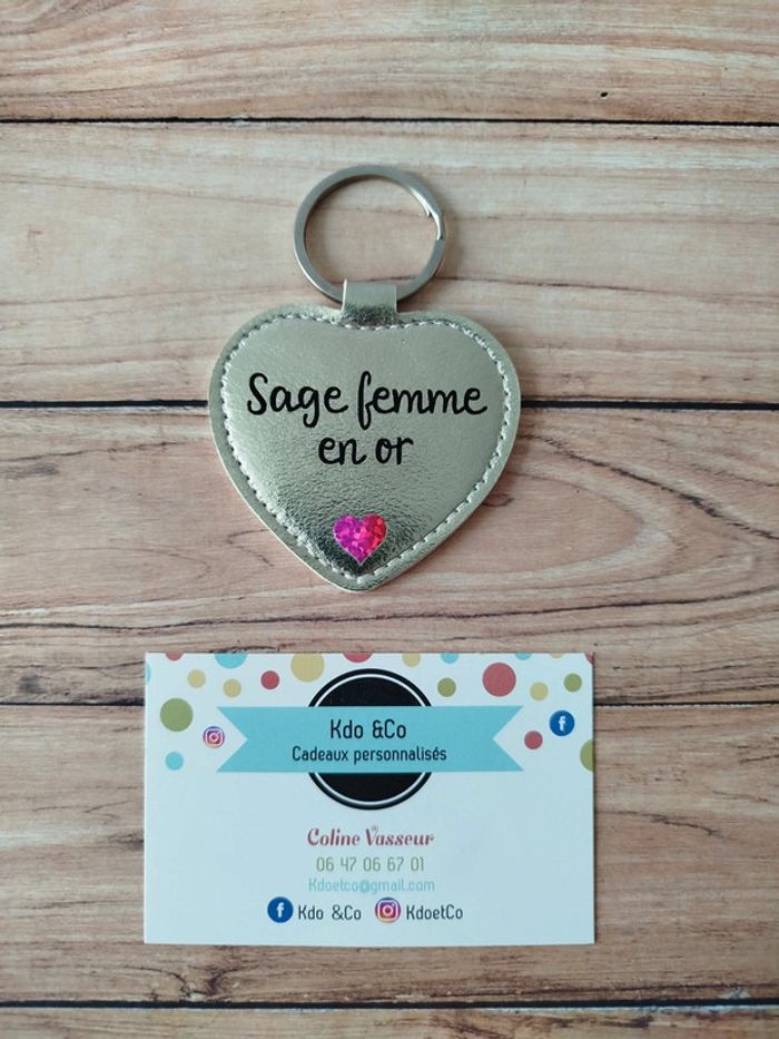 Porte-clé similicuir coeur sage femme en or - photo numéro 1