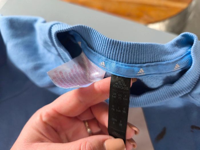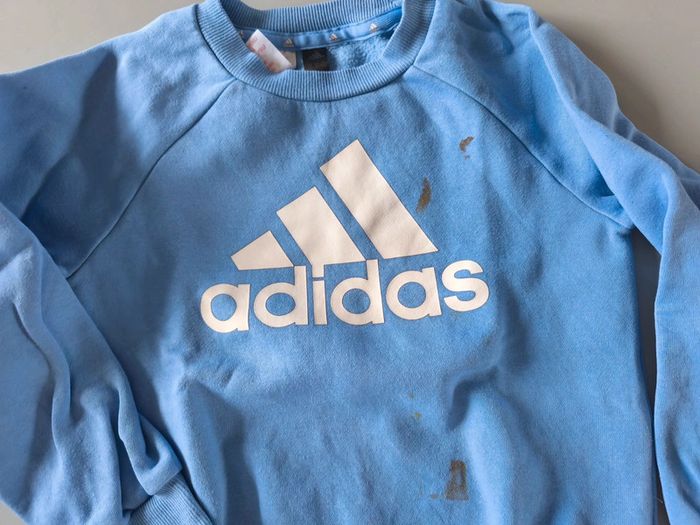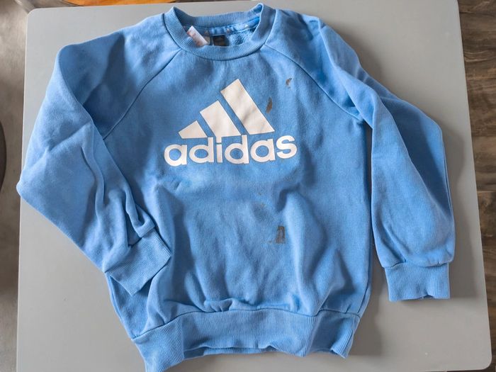 Sweat adidas , taille 5/6 mais taille comme un 6 ans . Plusieurs tâches devant , mais peut être qu il peut être teint en plus foncé pour les cachees . Marque adidas Taille 5/6 ans #6ansgarconalexiaguillou2206