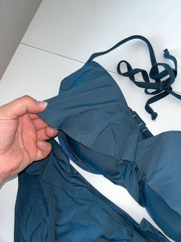 Maillot de bain , deux pièces Couleur : bleu canard Taille 38 , le haut à une équivalence à peu près un 90C ( mais peut être moduler ) le lien se règle à l’aide d un noeud autour de la nuque Porté que sur deux mois , très bon état Volants sur le haut et le bas #38femmealexiaguillou2206 #maillotdebainalexiaguillou2206