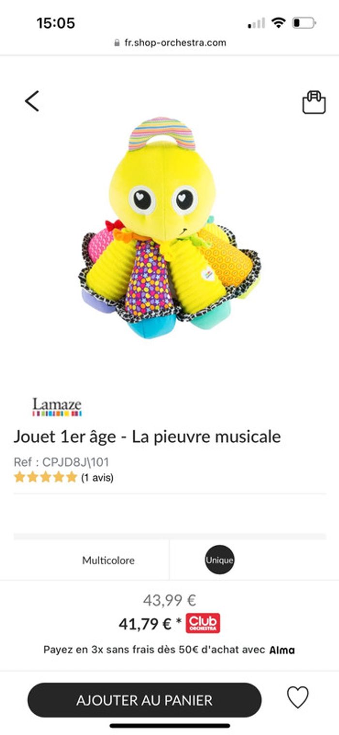 Pieuvre musicale , un son différent sur chaque tentacule ( un peu comme le piano ) une intonation par touche. Même principe . Acheté 41,79 € chez orchestra Marque : Lamaze #jeuxalexiaguillou2206