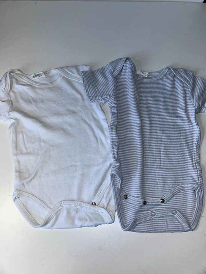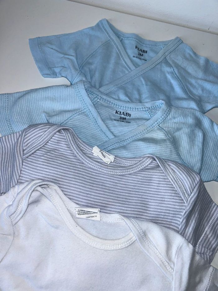 Lot de 4 bodies manches courtes 2 kiabi qui s ouvrent devant 2 tissaia Les bleus sont taché ( voir photo ) sinon le le blanc un peu jauni a l encolure , le reste ok 3 mois #3moisgarconalexiaguillou2206