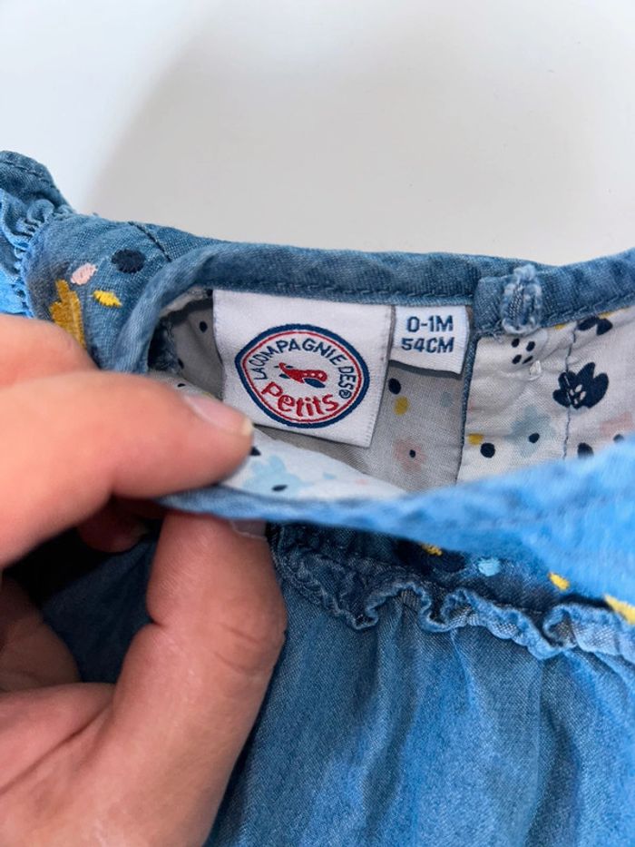 Robe en jean , fleurs brodées 0/1 mois , taille assez grand comme un 1 mois La compagnie des petits #1moisfillealexiaguillou2206