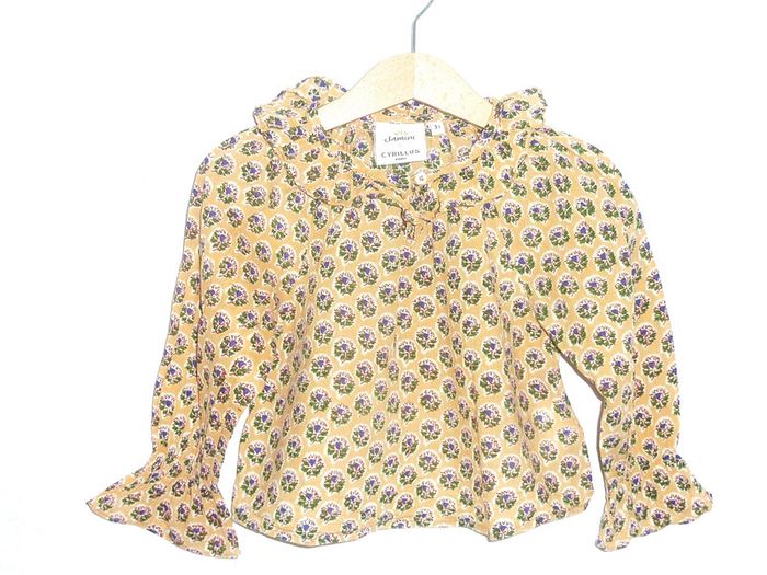 Pour voir mes annonces dans cette taille, tapez: #karinelillefille3ans Issue de la collab Jamini et Cyrillus, blouse en parfait état au col volanté. Imprimé fleuri vert et violet sur fond abricot