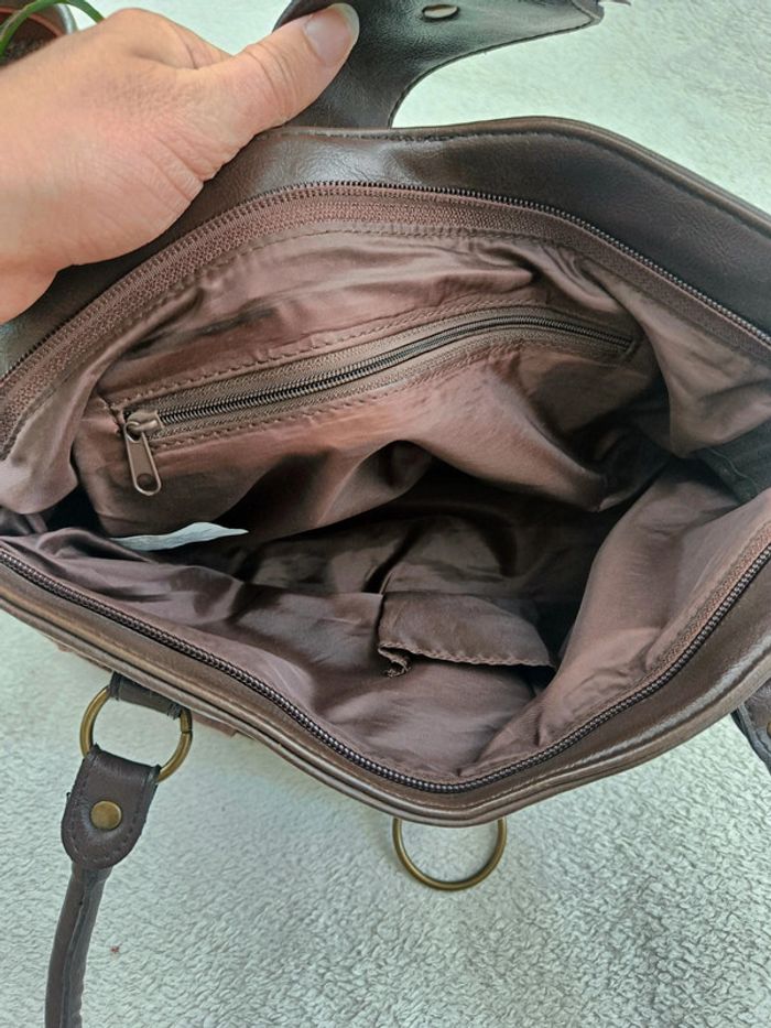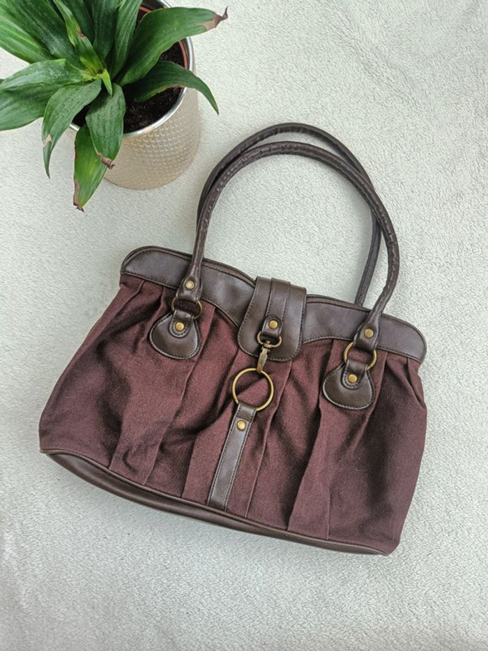 Sac a main marron similicuir tissus Style vintage avec boucle Dimensions : longueur 39cm, hauteur 23cm, profondeur 8cm, hauteur anses 21cm