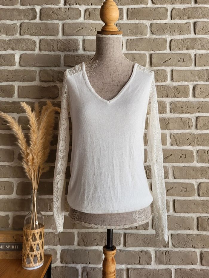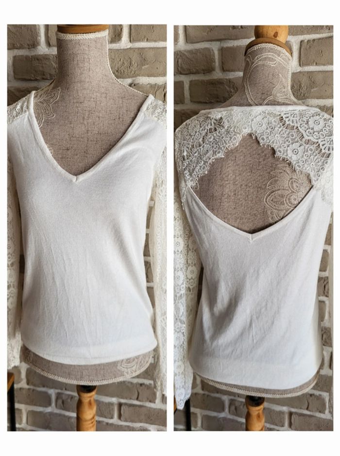 💝 Bénéficiez d'une réduction en créant lot dans mon dressing 🛍️ 🌸 Joli pull Naf Naf en parfait état 🎀 Maille fine et douve de couleur blanc cassé Manches en dentelle florale 🪷 Coupe ajustée, col V Magnifique décolleté dans le dos 🍥 Taille XS 34 🩷 Très beau avec un jean slim ou une jupe taille haute pour un effet plus habillé Son style romantique et raffiné conviendra aussi parfaitement à une occasion spéciale