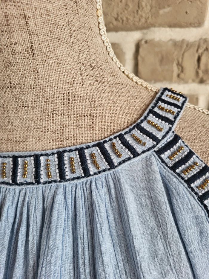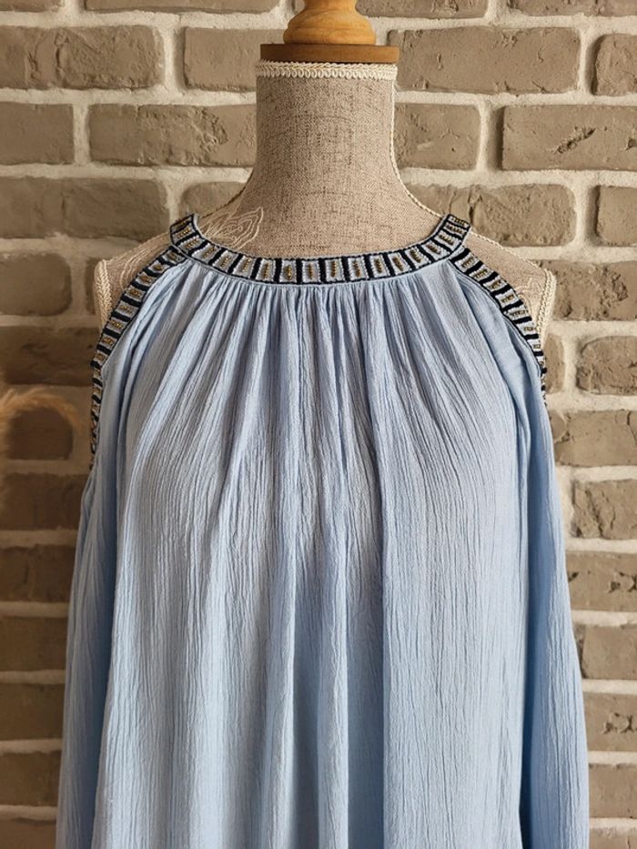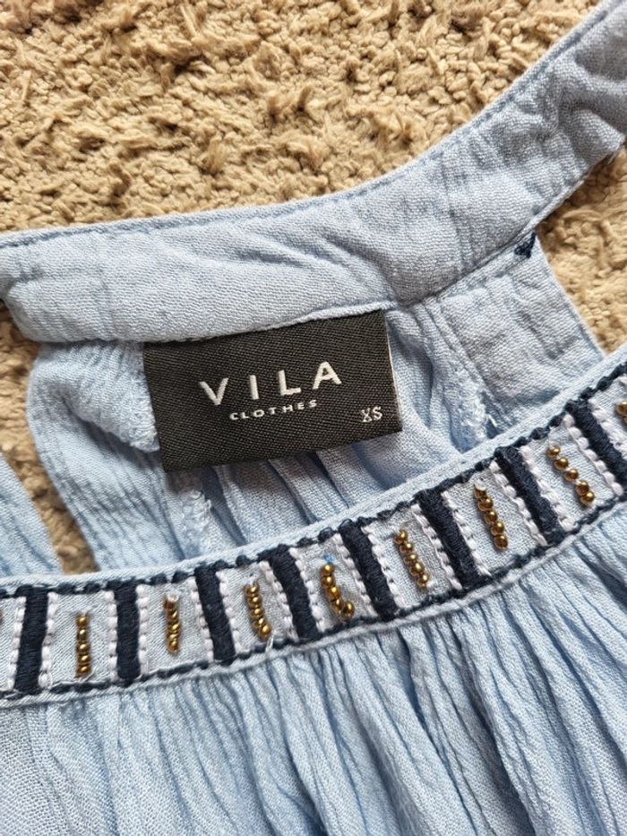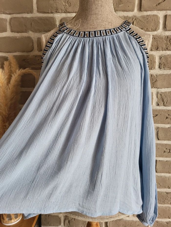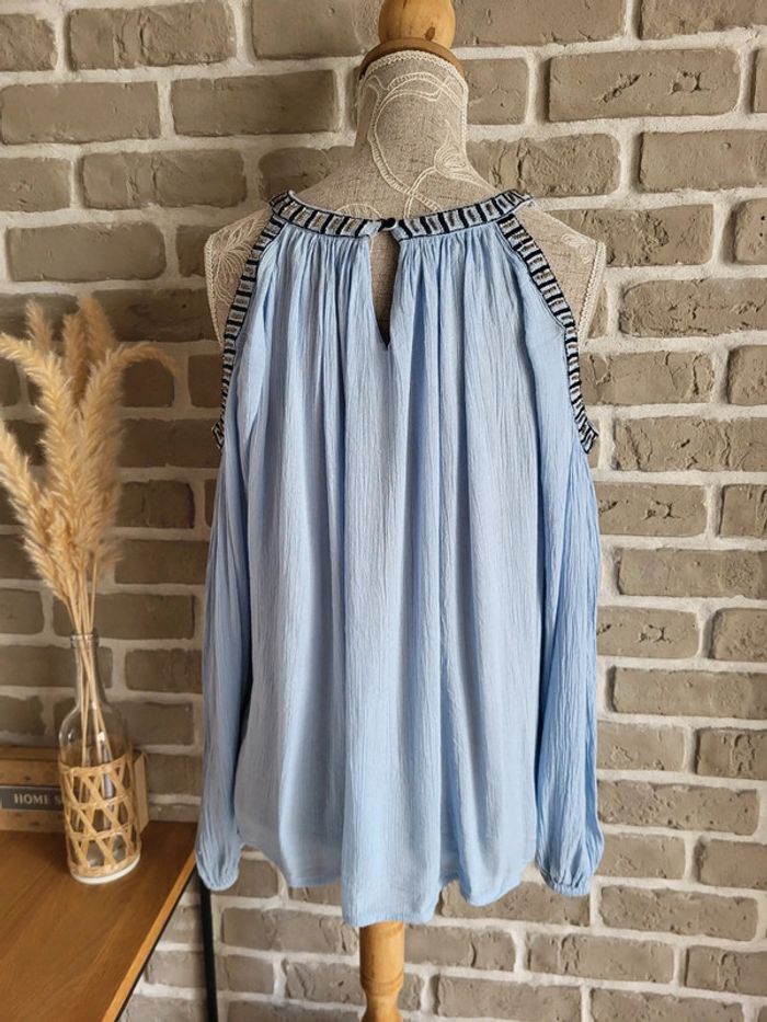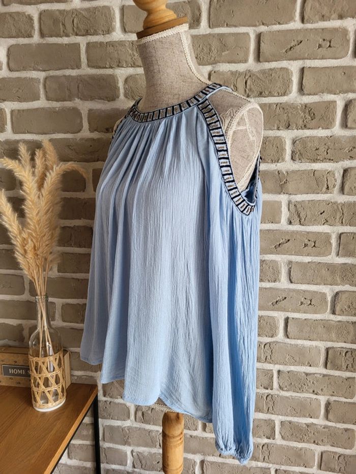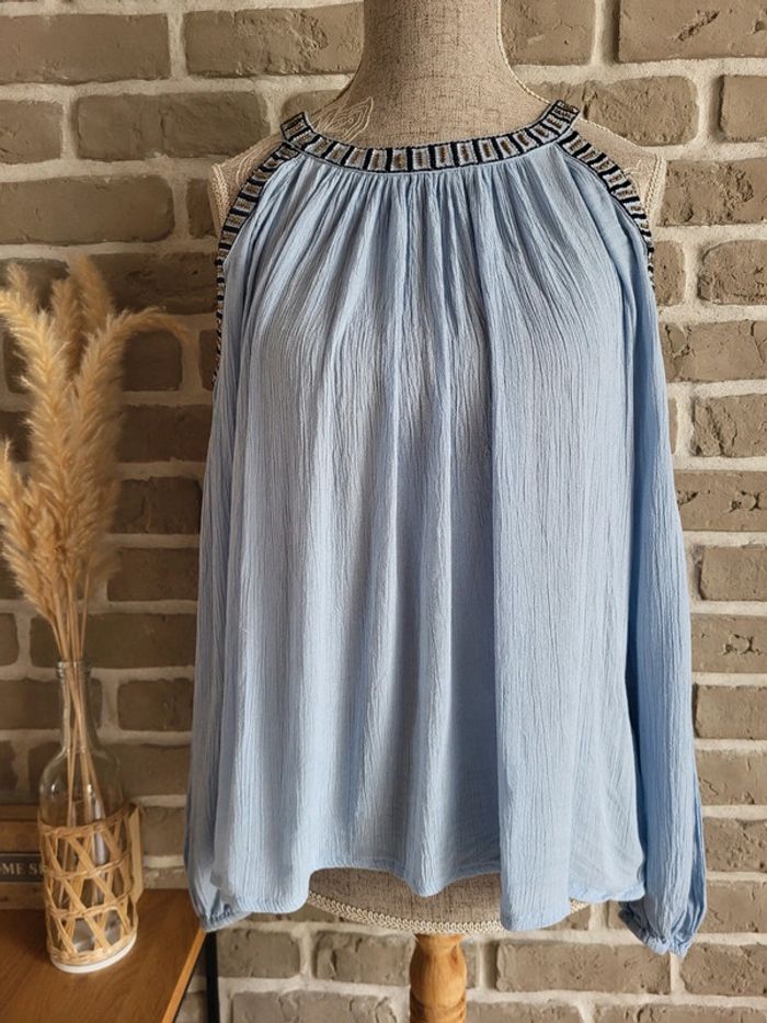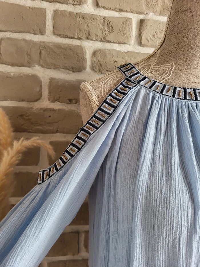 💝 Bénéficiez d'une réduction en créant lot dans mon dressing 🛍️ 🌸 Jolie blouse Vila en très bon état, sans défaut 🎀 Tissu léger et fluide avec effet froissé dans une douce couleur bleu ciel 🪷 Coupe ample et évasée Épaules dénudées avec broderies et perles dorées Manches longues avec poignets élastiqués Ouverture en goutte d'eau à l'arrière par un bouton dans la nuque 🍥 Taille XS 34 qui peut également convenir à du S 36 🩷 Associez-la à un short en jean ou une longue jupe blanche, vous obtiendrez un look bohème irrésistible !