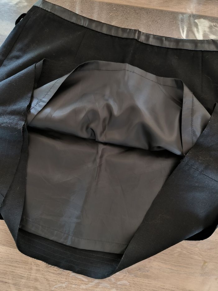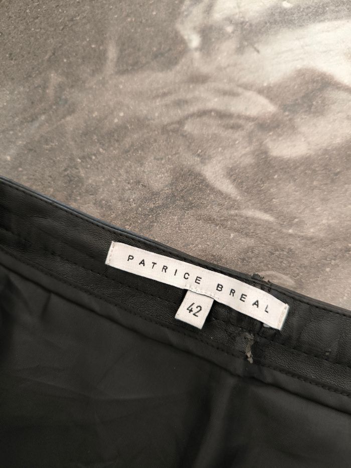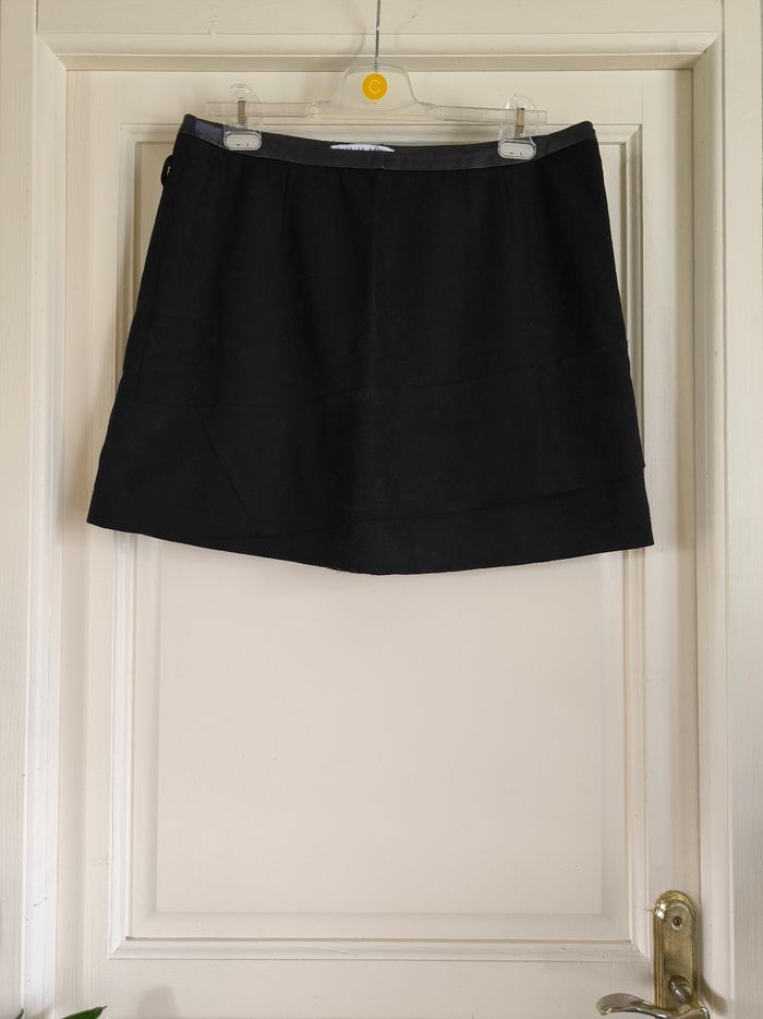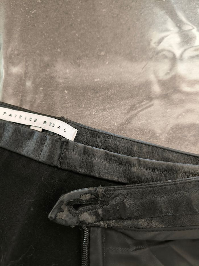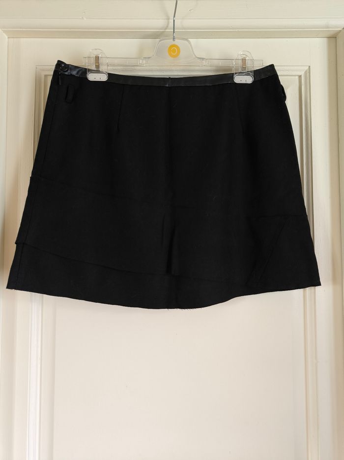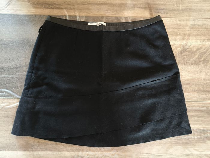Jupe courte Marque Patrice Breal Taille 42 • Coloris noir • Fermeture sur le côté avec bouton • Bande en simili cuir • Petits détails de couture sur le dessus • Doublure • Tissu souple • Non stretch • Contient de la laine • Similicuir abîmé/écaillé Largeur taille : 43 cm Longueur totale : 44 cm En état satisfaisant #evelyne_taille_42