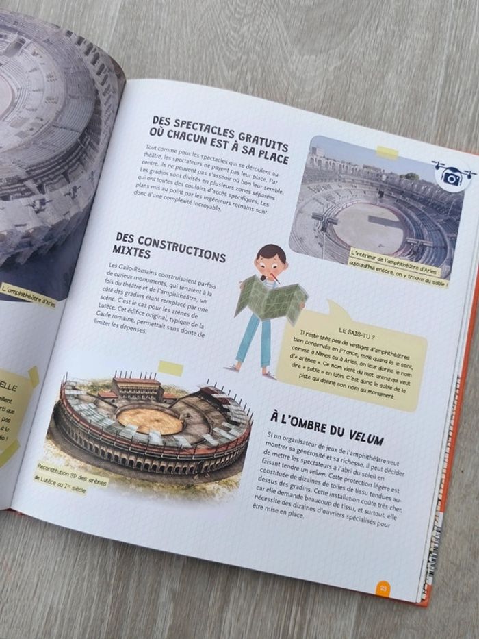 📍Livre Neuf ! 📍Voir avec un drone - Les Gallo-Romains. 🌈Résumé🌈 👉Comment les Romains ont-ils influencé la construction des villes en Gaule conquise ? Quels spectacles étaient joués au théâtre et dans l'amphithéâtre ? Est-ce que l'empereur pouvait vraiment décider de la mise à mort d'un gladiateur en baissant son pouce ? 👉Avec ce livre, enfile ta tenue d'archéologue et pars pour un voyage dans le temps. Marche dans les rues des villes, explore les lieux où habitaient les Gallo-Romains, apprends comment ils vivaient au quotidien... Te voilà en Gaule au temps des Romains ! 👉Au cours de ton voyage dans le temps, survole avec un drone la ville d'Arles, du théâtre antique à l'amphithéâtre en passant par les thermes, et assiste à un combat de gladiateurs. 👉EN BONUS Des contenus exclusifs dans une appli GRATUITE ! 1. Télécharge gratuitement l'application SnapPress. 2. Scanne les pages du livre qui portent le symbole du drone. 3. Découvre 7 vidéos de la ville d'Arles filmées par un drone et la reconstitution en vidéo d'un combat de gladiateurs. 👉Pour trouver d'autres livres c'est par ici : 🔎#elisabethdesignLivre 📫⏳ Envoi rapide et soigné le jour même de l'achat dans la mesure du possible! 🤝 Frais de port ajusté au plus bas.