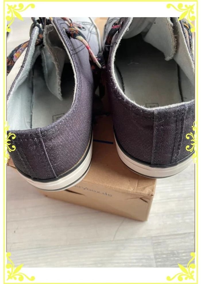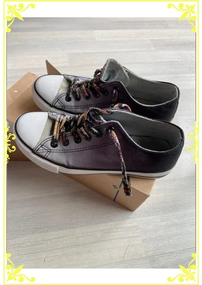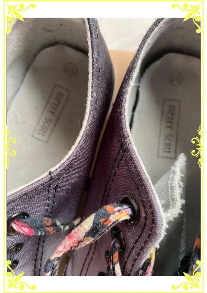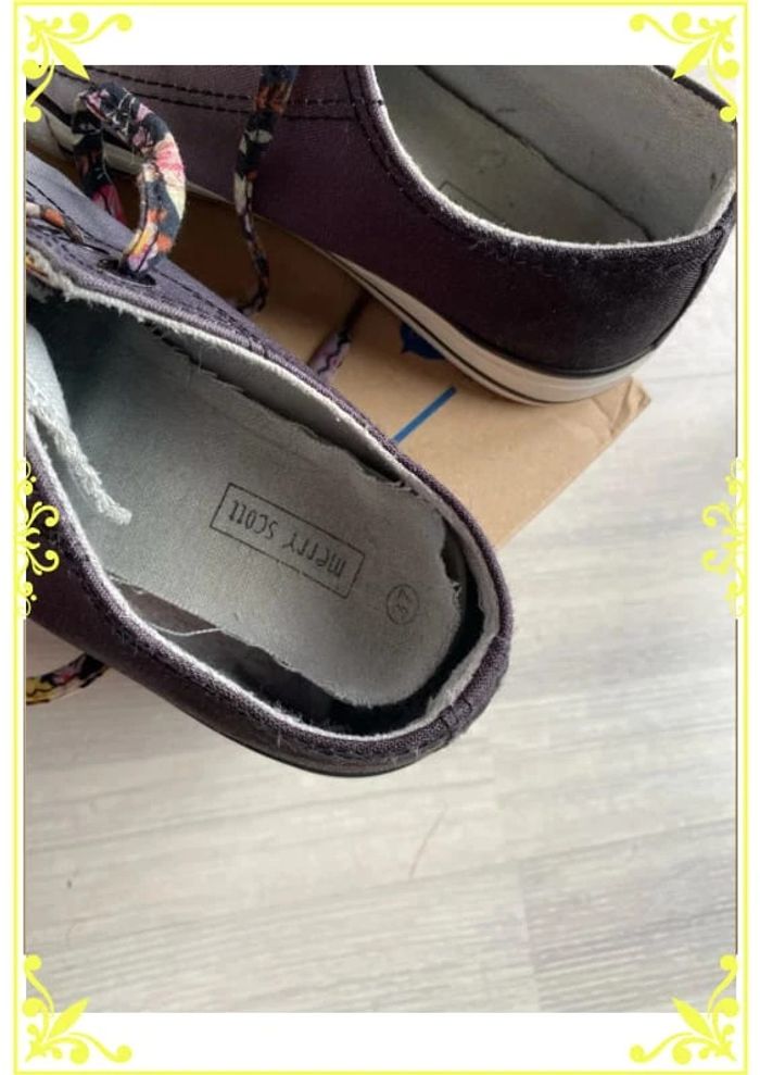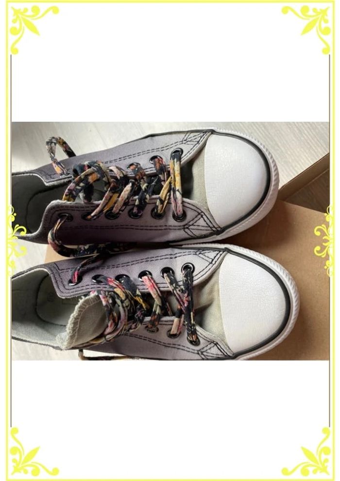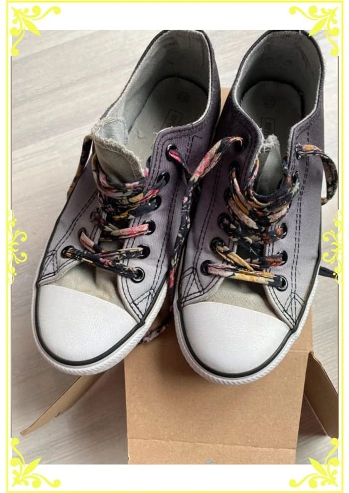 En toile, grises, lacets multicolores La semelle intérieure s’est décollée suite au passage à la machine à laver, à recoller Sinon elles sont en bon état