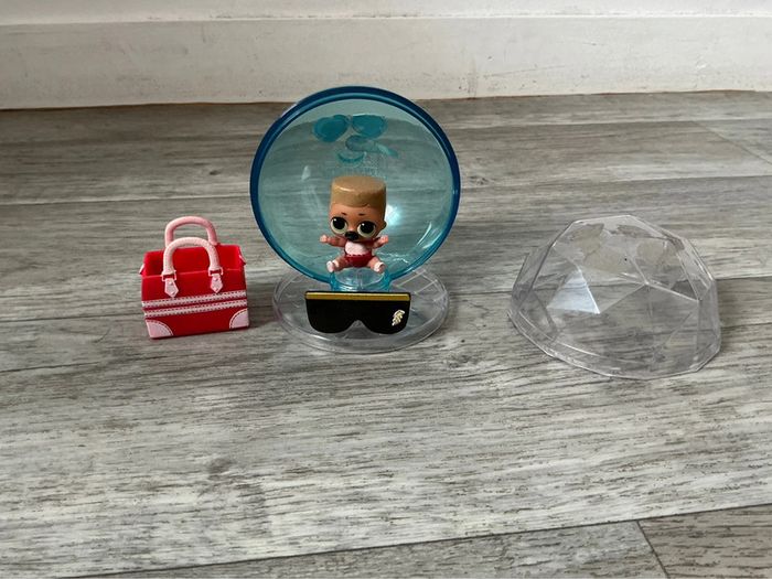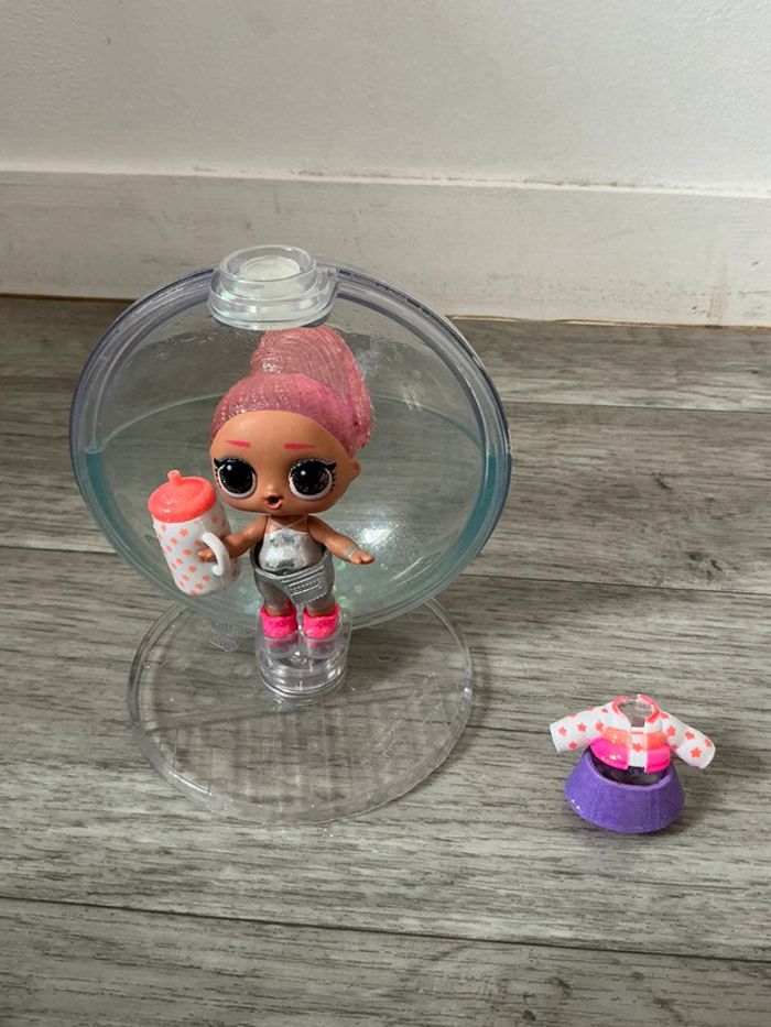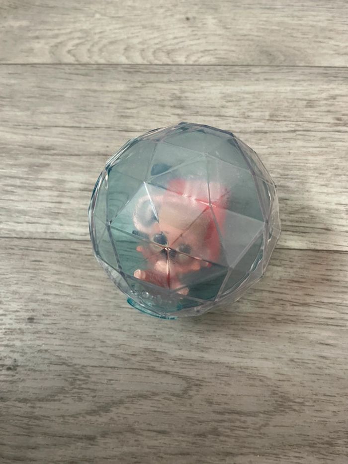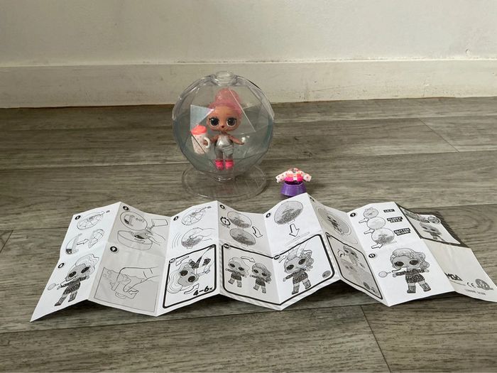 Boule L.O.L. avec de la neige et 7 surprises dont 1 poupée aux habits scintillants et cheveux magiques. Boule à facettes superposable avec support. Livret inclus. La petite boule avait des autocollant devant d’où le côté un peu passé.