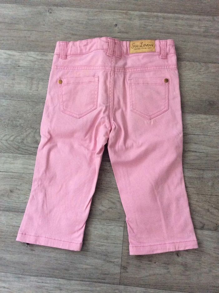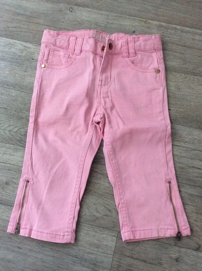 pantacourt fille en coton épais (style jeans) couleur rose clair avec fermetures métal en bas de chaque jambe. taille ajustable taille 7 ans marque tissaia