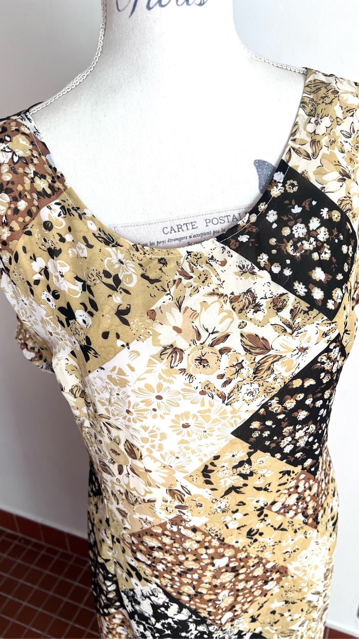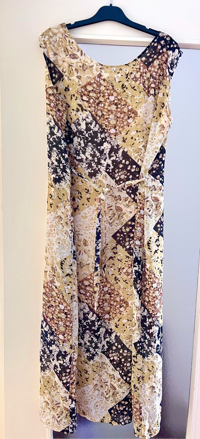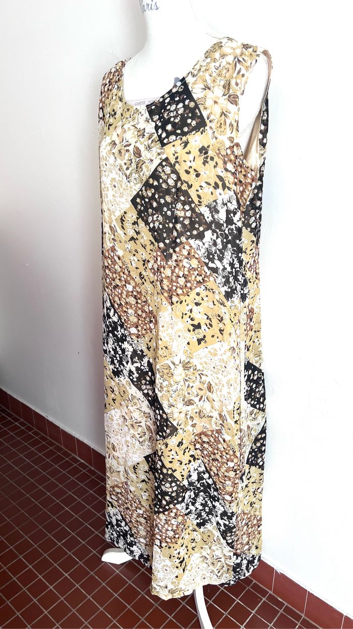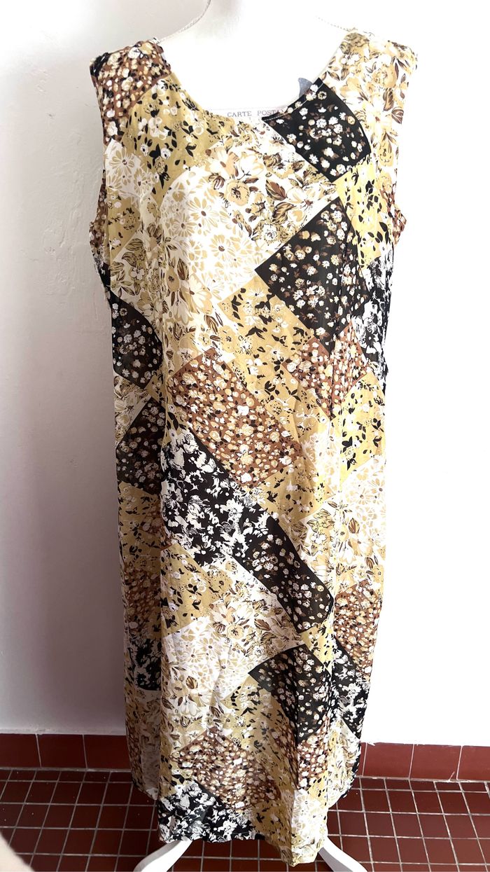 Robe d'été longue, sans manche Taille indiqué XXL mais taille 48 Coloris noir, blanc, jaune moutarde, marron clair Motifs petites fleurs Lien à nouer au dos Maison non fumeur et sans animaux Robe doublée d'un tissu satiné 58 cm de largeur (robe mesurée à plat d'aisselle à aisselle) 123 cm de longueur Les bretelles ont été recousues de l'intérieur pour resserrer le décolleté mais les points de couture peuvent être détachés. Maison non fumeur et sans animaux 📩Je réponds rapidement aux messages 📦Envoi rapide et soigné