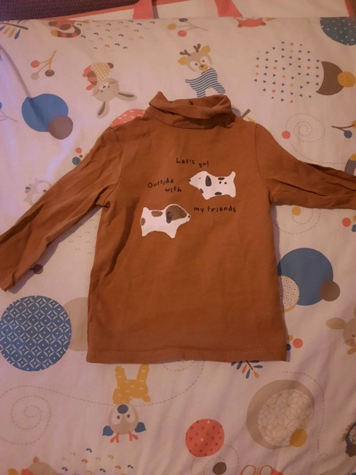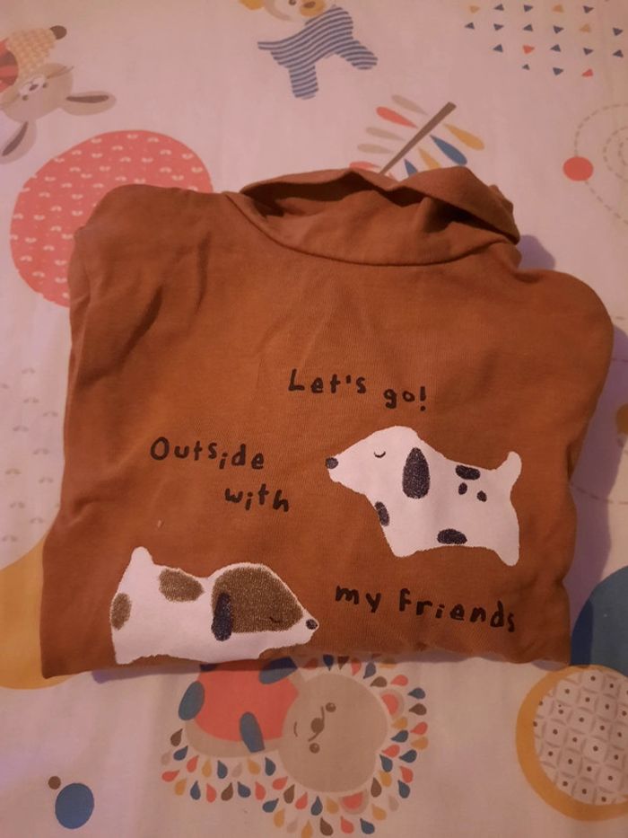》Maillot à col roulé à manches longues avec ouverture sur l'arrière motif chiens avec phrase "lets go outside with my friends" en très bon état. Peu porté. Taille 6 mois.