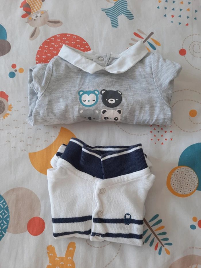 》1 body style polo marinière à manches courtes avec pression sur le devant 》1 body animaux à manches longues avec pression sur le derrière Le tout en très bon état. Très peu porté. Taille 6 mois.