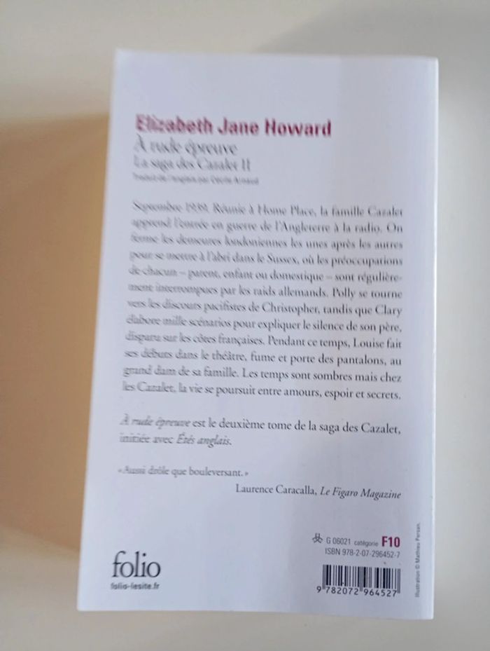 Septembre 1939. Réunie à Home Place, la famille Cazalet apprend l'entrée en guerre de l'Angleterre à la radio. On ferme les demeures londoniennes les unes après les autres pour se mettre à l'abri dans le Sussex, où les préoccupations de chacun - parent, enfant ou domestique - sont régulièrement interrompues par les raids allemands. Polly se tourne vers les discours pacifistes de Christopher, tandis que Clary élabore mille scénarios pour expliquer le silence de son père, disparu sur les côtes françaises. Pendant ce temps, Louise fait ses débuts dans le théâtre, fume et porte des pantalons, au grand dam de sa famille. Les temps sont sombres mais chez les Cazalet, la vie se poursuit entre amours, espoir et secrets. À rude épreuve est le deuxième tome de la saga des Cazalet, initiée avec Étés anglais. Éditeur ‏ : ‎ FOLIO 608 pages Dimensions ‏ : ‎ 10.8 x 2.4 x 18 cm Livre en très bon état Je vends un autre tome #phil_peg_cazalet #saga #cazalet #bourgeoisie #amour #secondeguerremondiale #famille #conditiondelafemme #angleterre #histoire