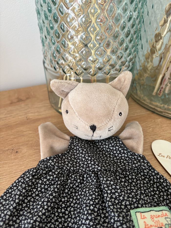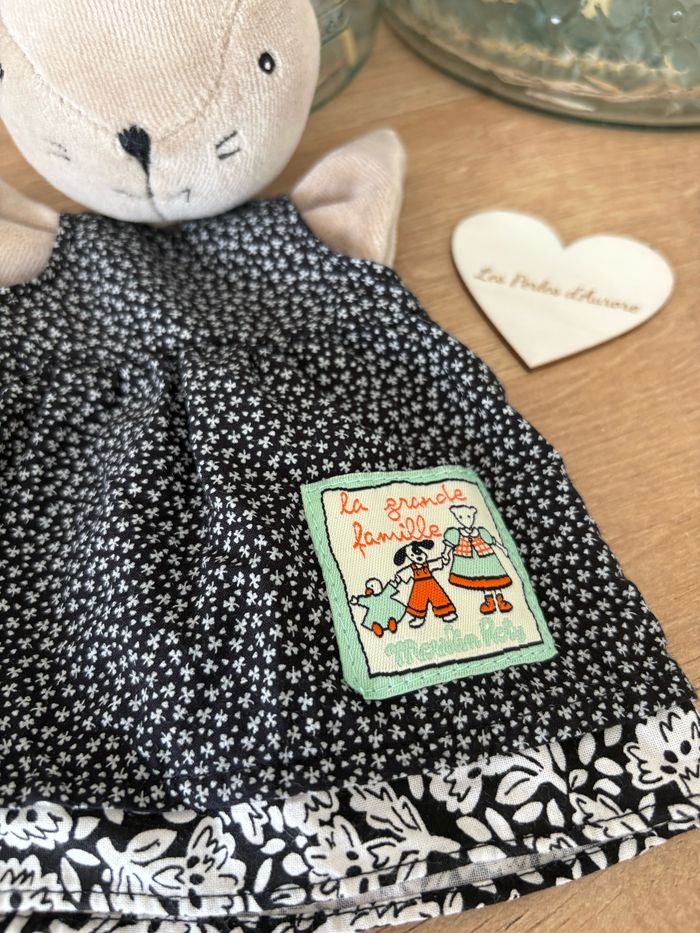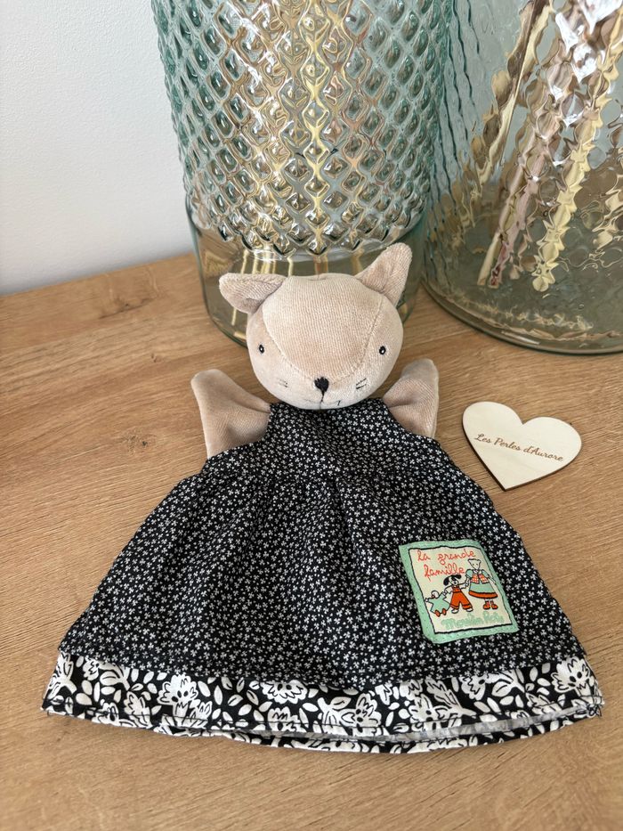 Marionnette doudou chat gris beige Robe noire fleuris La grande famille Moulin Roty Très bon état Réf : D1