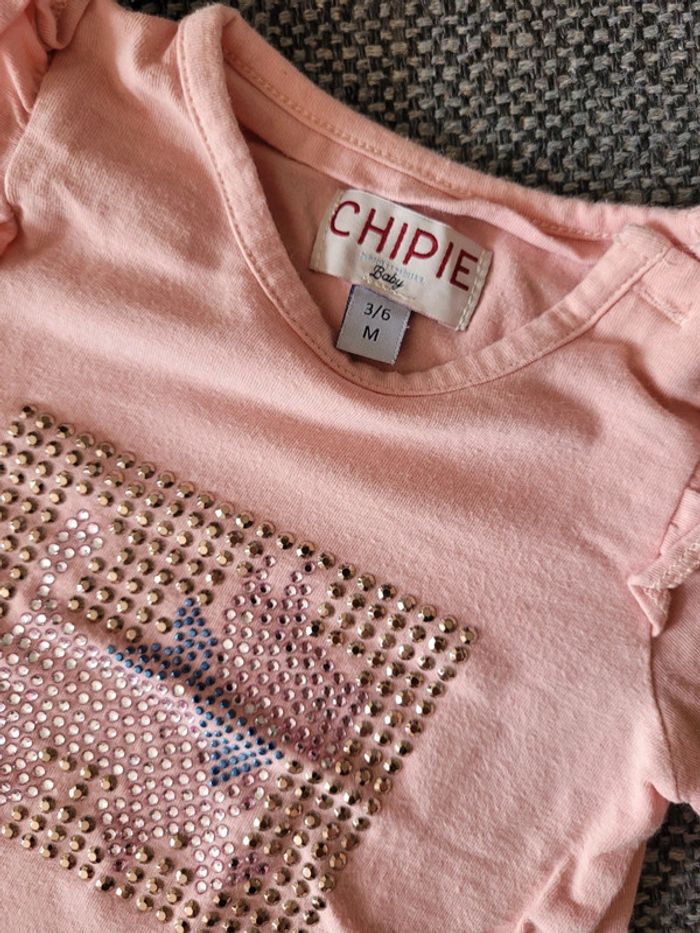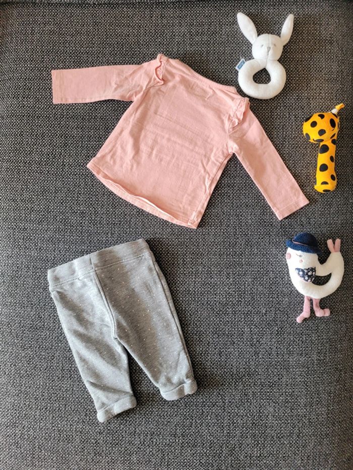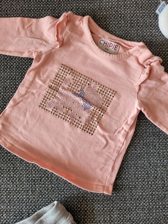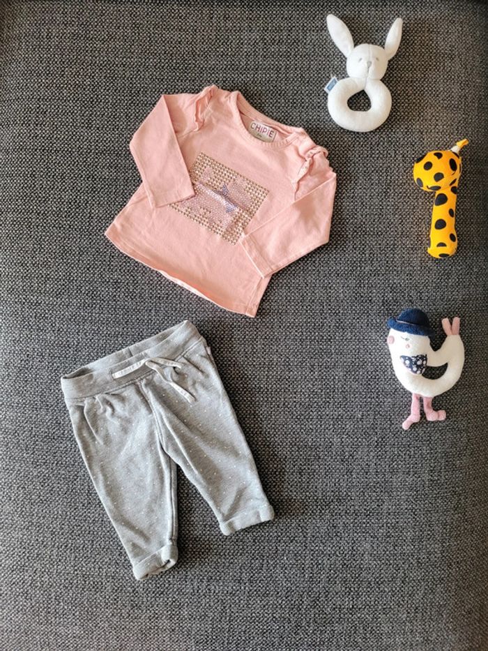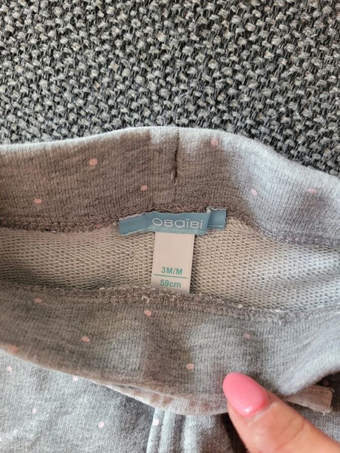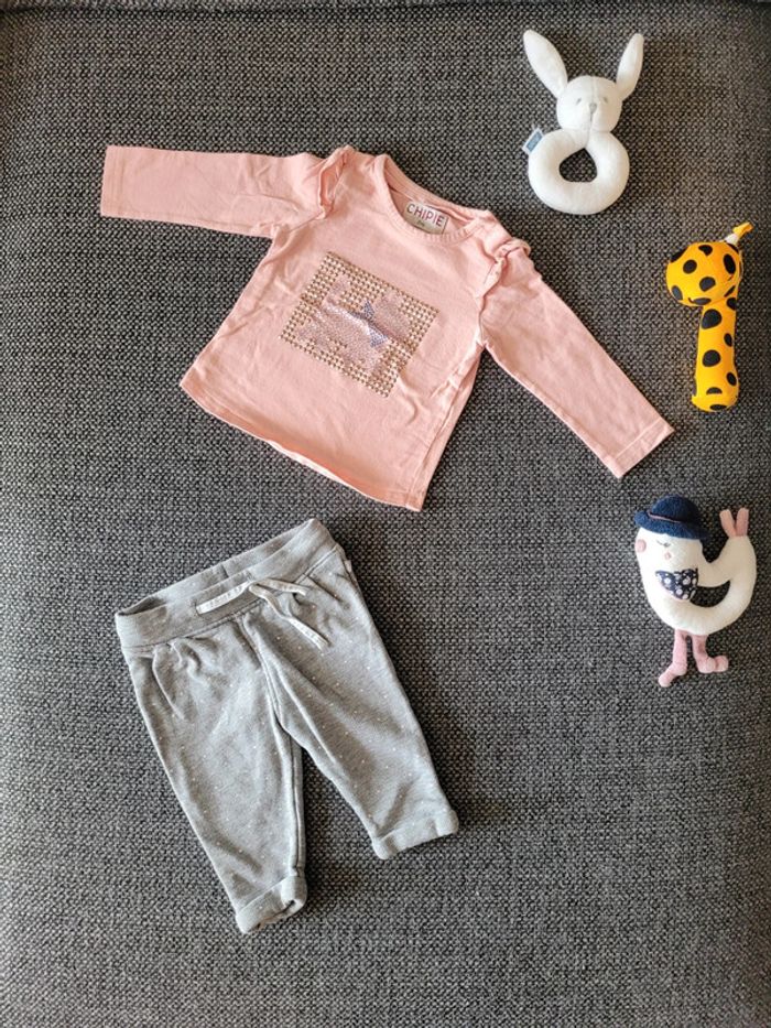 Ensemble pour fille de taille 3 mois Composé d'un t-shirt à manches longues en coton de la marque Chipie avec l'iconique chien et d'un bas en coton épais type sarouel de la marque Obaibi Couleurs gris et rose clair à motifs brillants Aucune tâche ni trou #mabi38780fille3mois